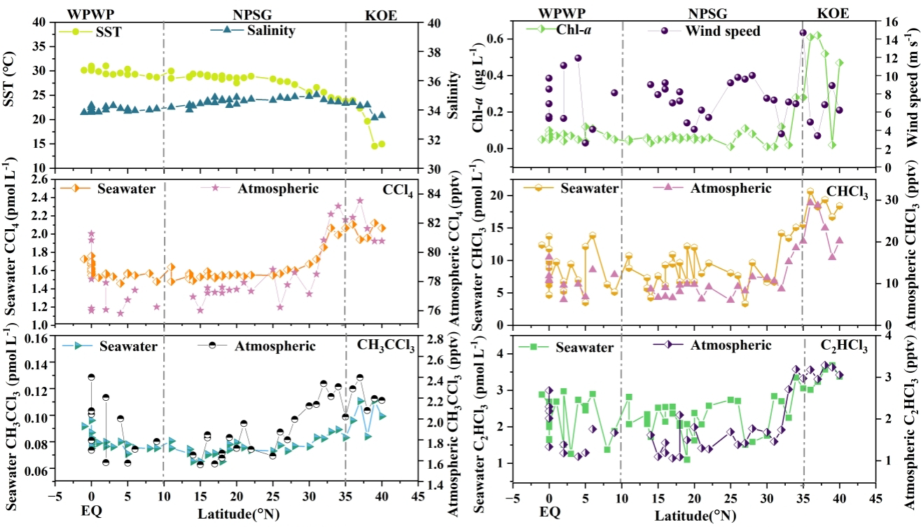 Figure 2Latitudinal distributions of SST, salinity, and Chl a, and surface seawater and atmospheric concentrations of CCl4, CHCl3, CH3CCl3, and C2HCl3, along with wind speed in the Western Pacific.