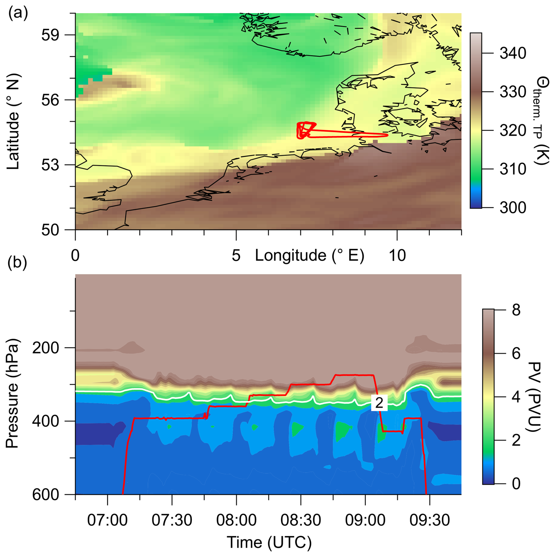 Figure 1ECWMF forecast data for 17 June 2024, 06:00 UTC (F07). The potential temperature along the thermal WMO tropopause and the flight path of F07 (red solid line) are shown in panel (a). Panel (b) shows a vertical cross-section of potential vorticity (PV) along the flightpath (red solid) line with the 2 PVU surface as marker for the dynamical tropopause in the model (white solid line).