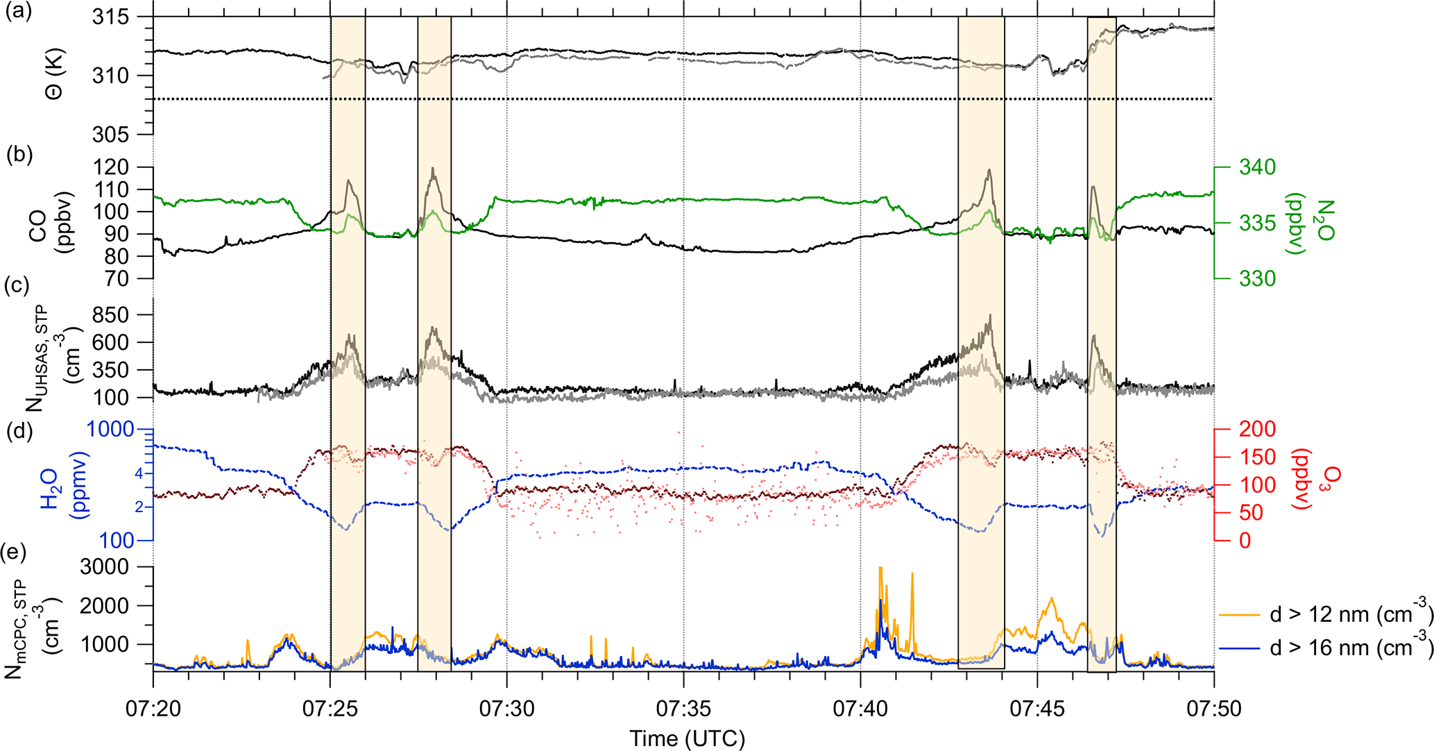 Figure 3Time series of trace gas and aerosol in-situ measurements for F07 on 17 June 2024 for the period between 07:20 and 07:50 UTC. Measurements conducted on the Learjet are in darker colors whereas measurements from the TPC-TOSS are in lighter colors. Row (a) shows the potential temperature (θ) with the tropopause derived from vertical trace gas profiles (dashed line), (b) trace gases CO (black) and N2O (green), (c) aerosol number concentration between 100 nm and 1 µm, (d) H2O (blue) and O3 (red) as well as (e) total aerosol number concentration from 12 nm (yellow) and 16 nm (blue) measurements. The orange shaded boxes mark the four analyzed periods with enhanced aerosol number concentration NUHSAS and CO mixing ratio.