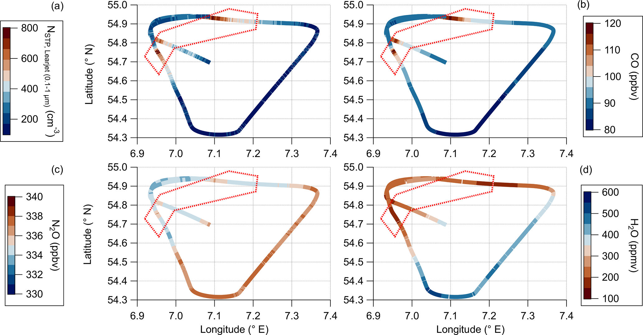 Figure 4Flight track of the first complete triangular pattern with deployed TPC-TOSS within the restricted air space. The pattern is flown at FL240 (approx. 7400 m) between 07:24 and 07:47 UTC. The colorcode represents different in-situ measurements onboard the Learjet: (a) total aerosol number concentration between 0.1 and 1 µm, (b) CO, (c) N2O and (d) H2O measurements. The red box surrounds the observed polluted air masses.