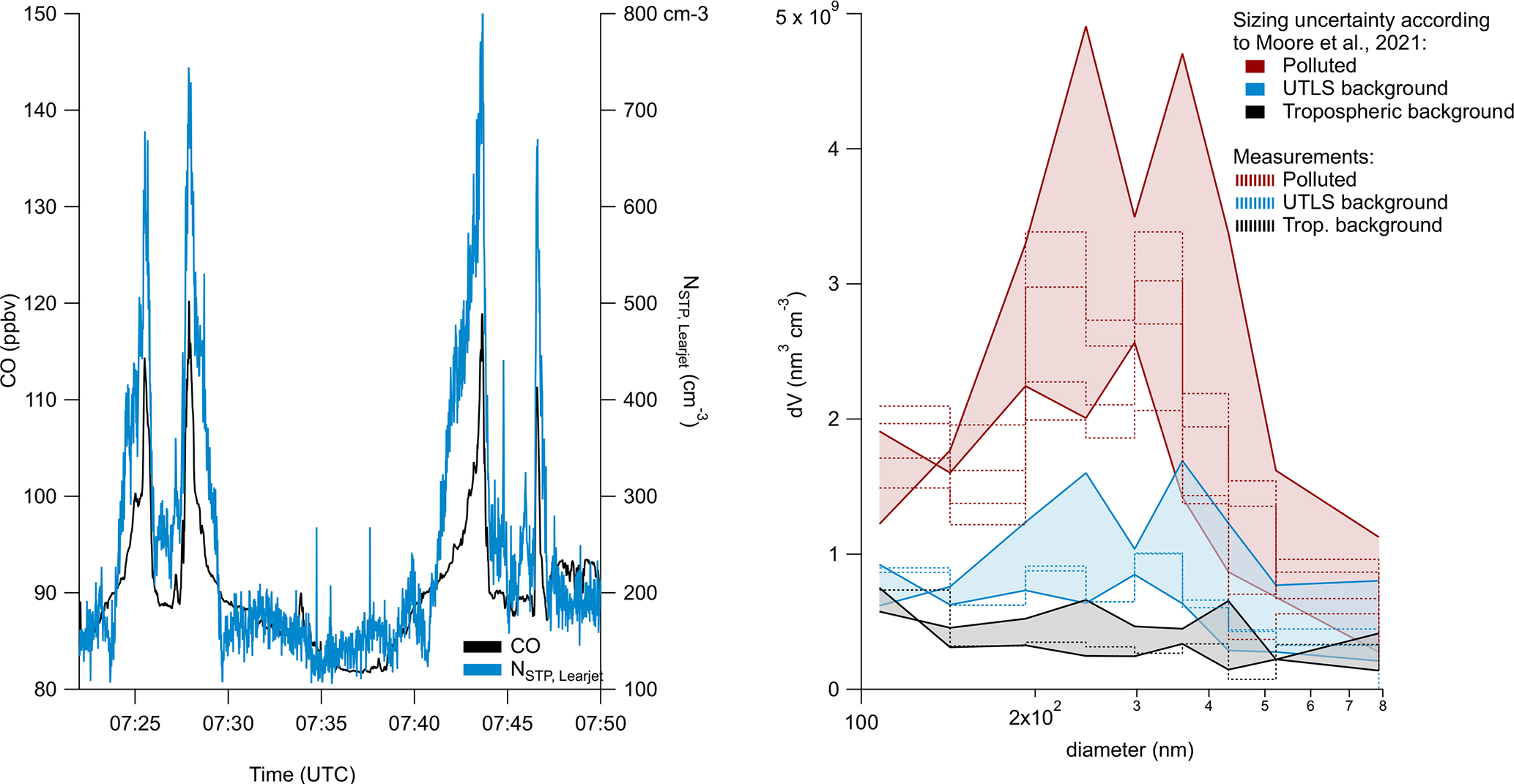 Figure 5Detailed analysis of measured polluted air masses with a time-series of particle number concentrations measured by the UHSAS on the Learjet (blue), and CO (black) (a), as well as measured volume distribution averaged over 10 s (see Table C1) for the polluted air masses (dark red), the UTLS background (bright blue) and the tropospheric background for the pattern (black). The shaded area represents the uncertainty range due to sizing errors of absorbing particles (b). The dashed lines represent the original measurement data with the color corresponding to the atmospheric regime.