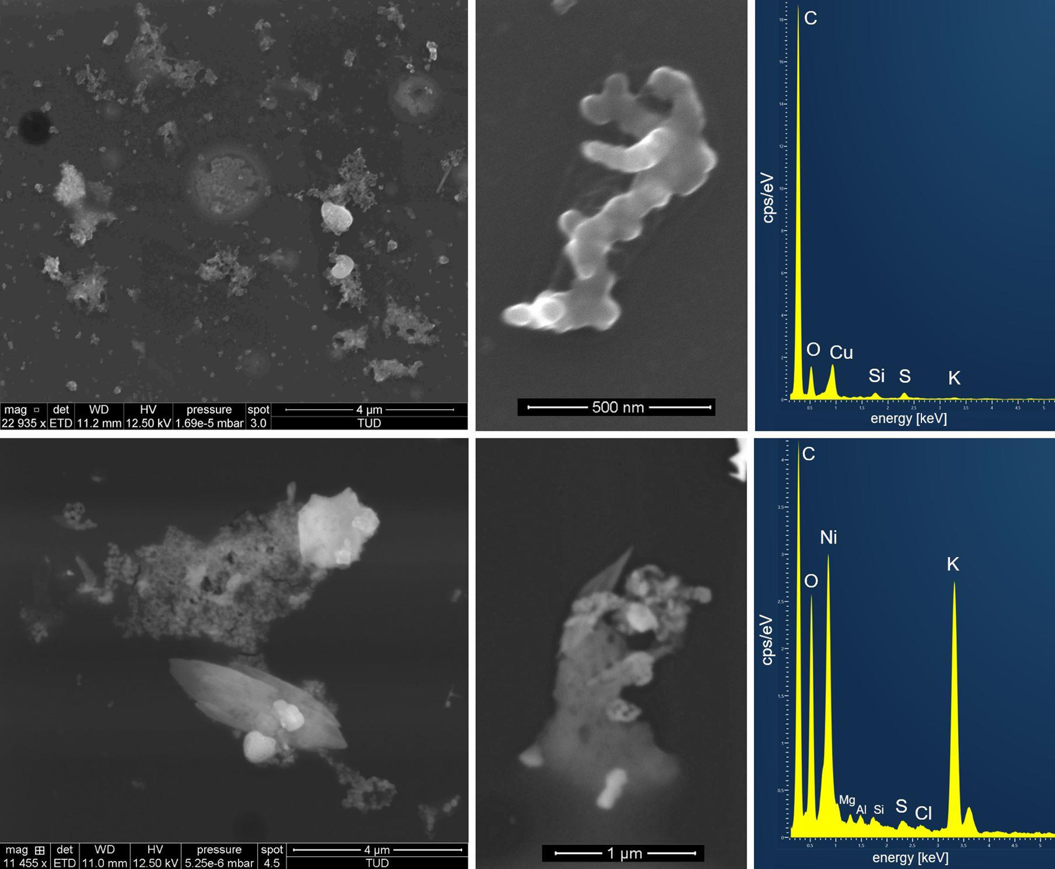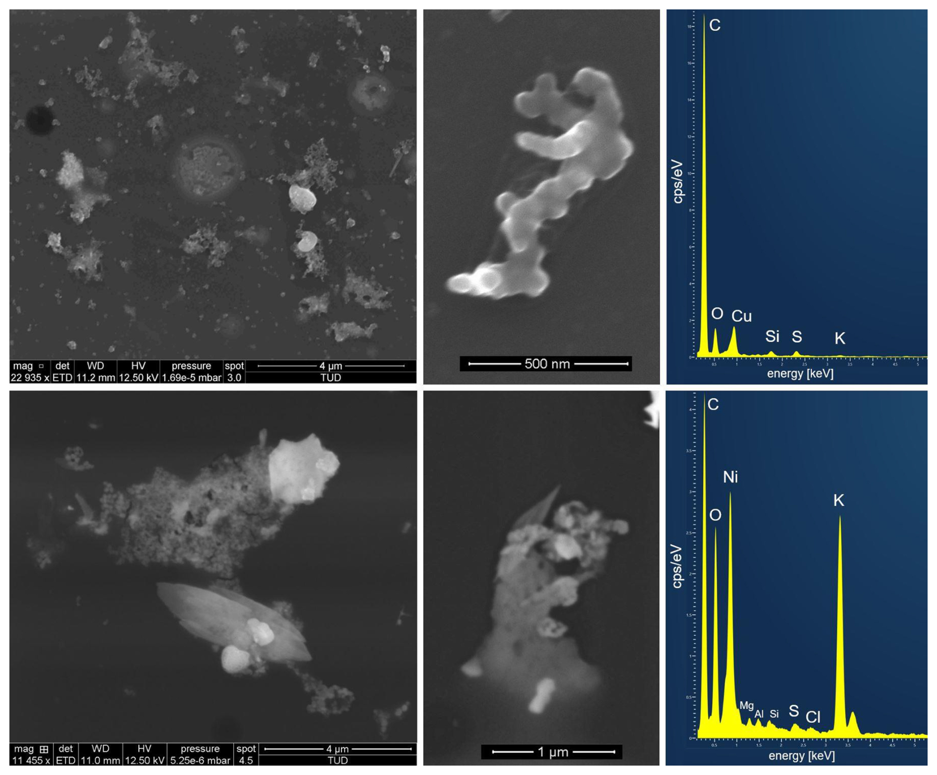 Figure 6Secondary electron images and referring energy dispersive X-ray spectra of (upper row) two typical soot like BB particles and (lower row) two typical K-rich BB particles from the investigated sample (Ni and Cu-peaks in the spectrum are due to the Ni-grids respectively the Cu-grid holder used in SEM analysis).