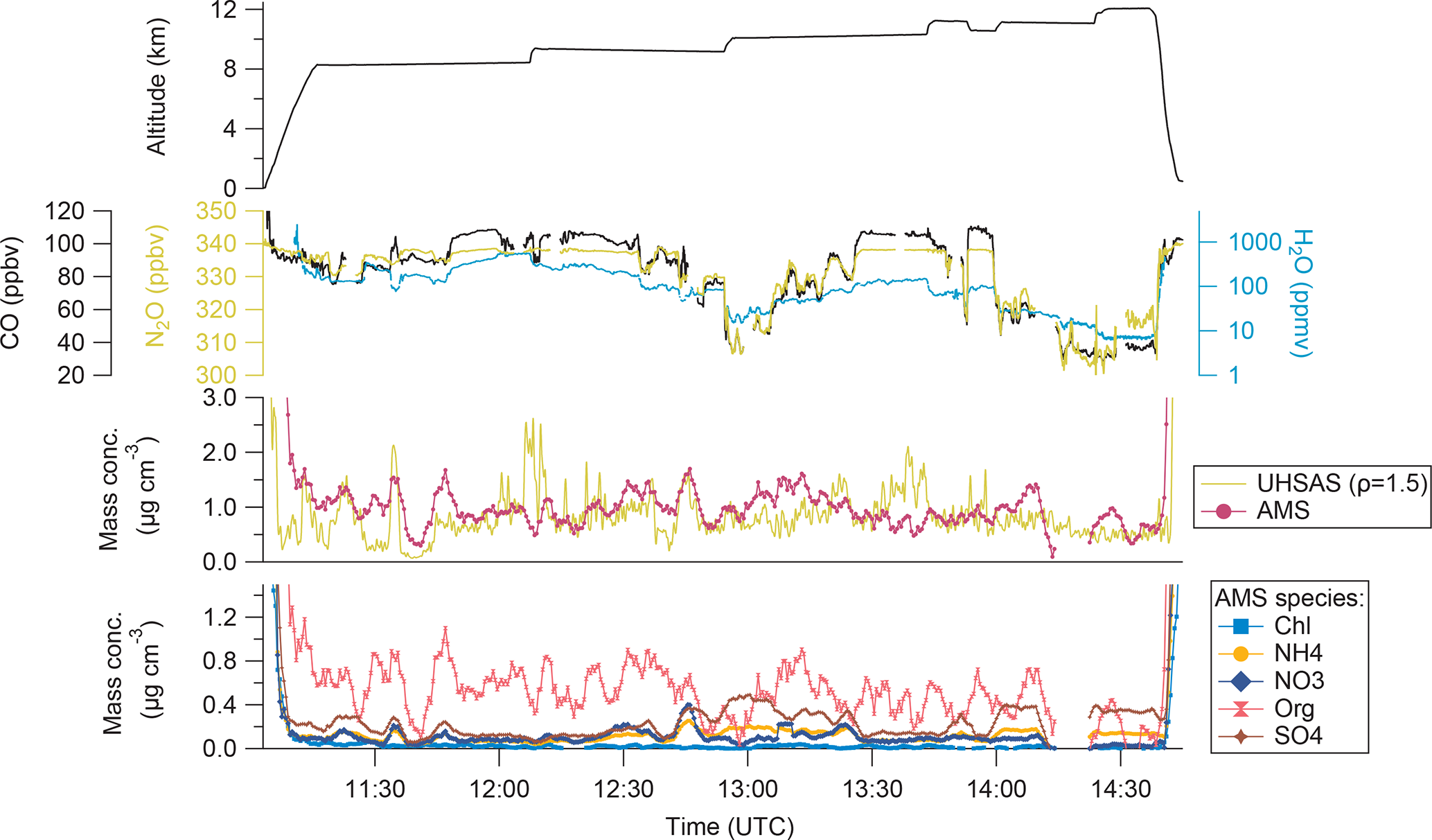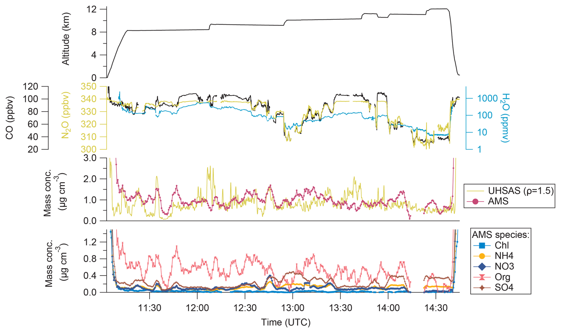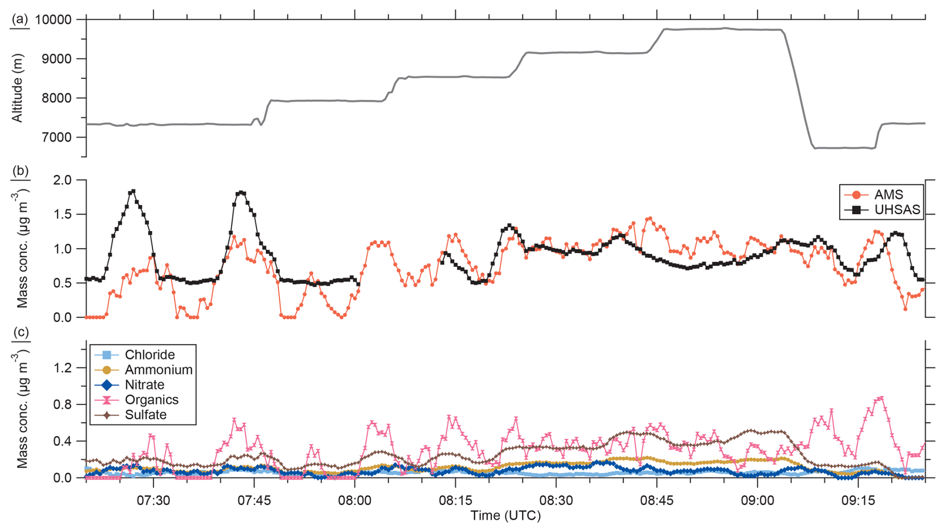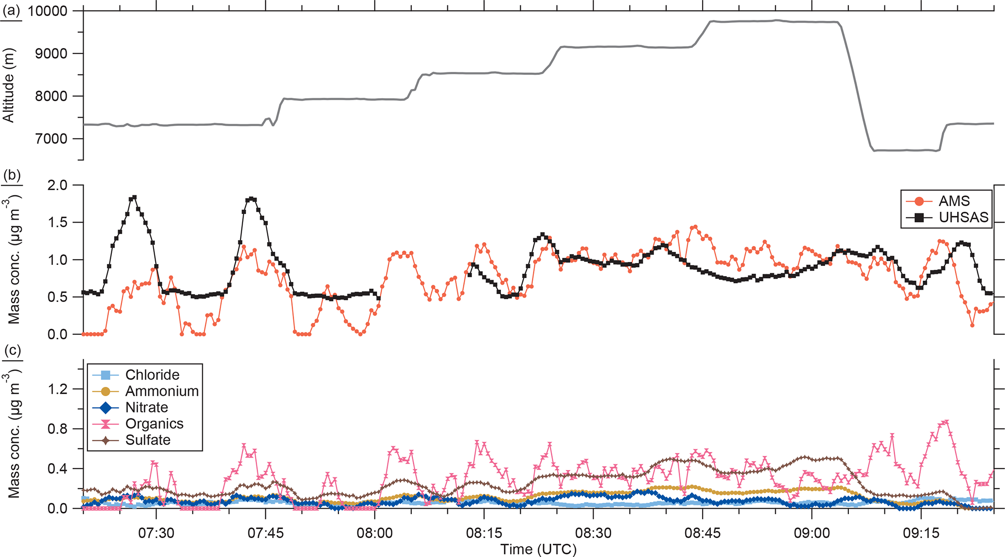 Figure 7Time series of the GPS altitude (a), the total mass concentration of the AMS (b) and the UHSAS (b) and the individual mass concentrations for the AMS species (c). The AMS and UHSAS measurements are averaged over 3.5 min with the box-car method.