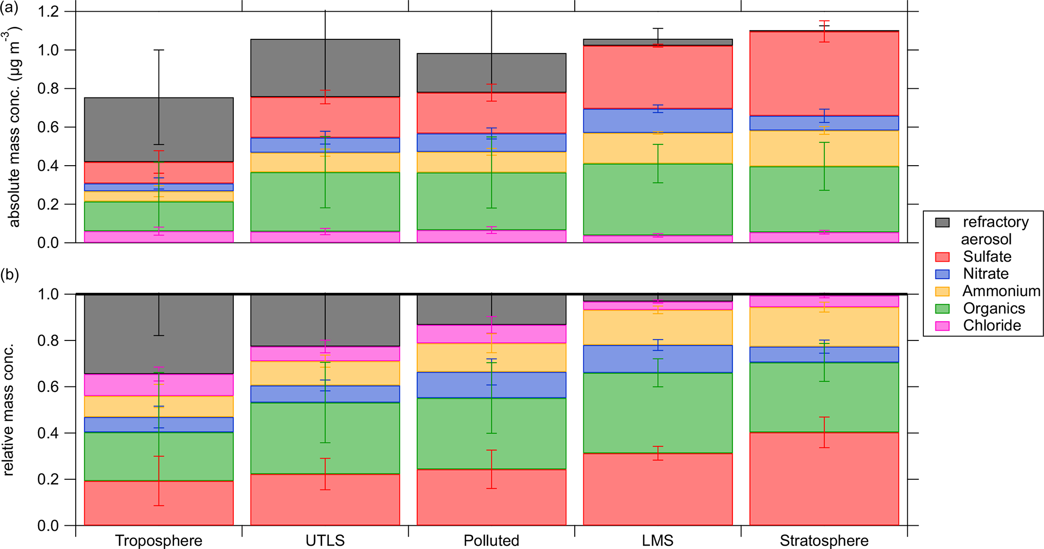Figure 12Relative mass concentration for the non-refractory aerosol species (chloride in pink, ammonium in orange, nitrate in blue, organics in green and sulfate in red) and estimated highest possible refractory aerosol (rA) (black) in 500 m vertical bins between 7 and 10 km. The error bars represent the standard deviation in the altitude bins.