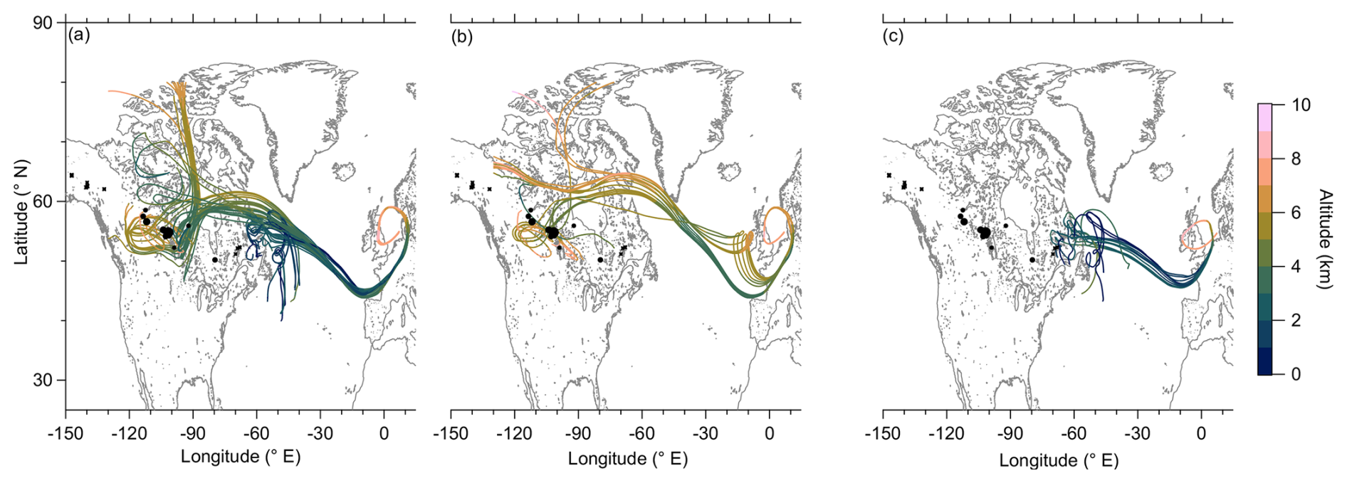 Figure 9Back trajectories for the different observed regimes ((a) pollution events, (b) UTLS background and (c) tropospheric background) in F07. The altitude of the trajectories is represented by the colorcode of the solid lines. Additionally, we added fire observation data provided by CWFIS (circles) in the vicinity of the trajectories. The size of the circles represents the size of the forest fire. Furthermore, we added the fire locations detected by the satellite in the GFAS retrievals of 10 June 2024 with fire radiative power (crosses).