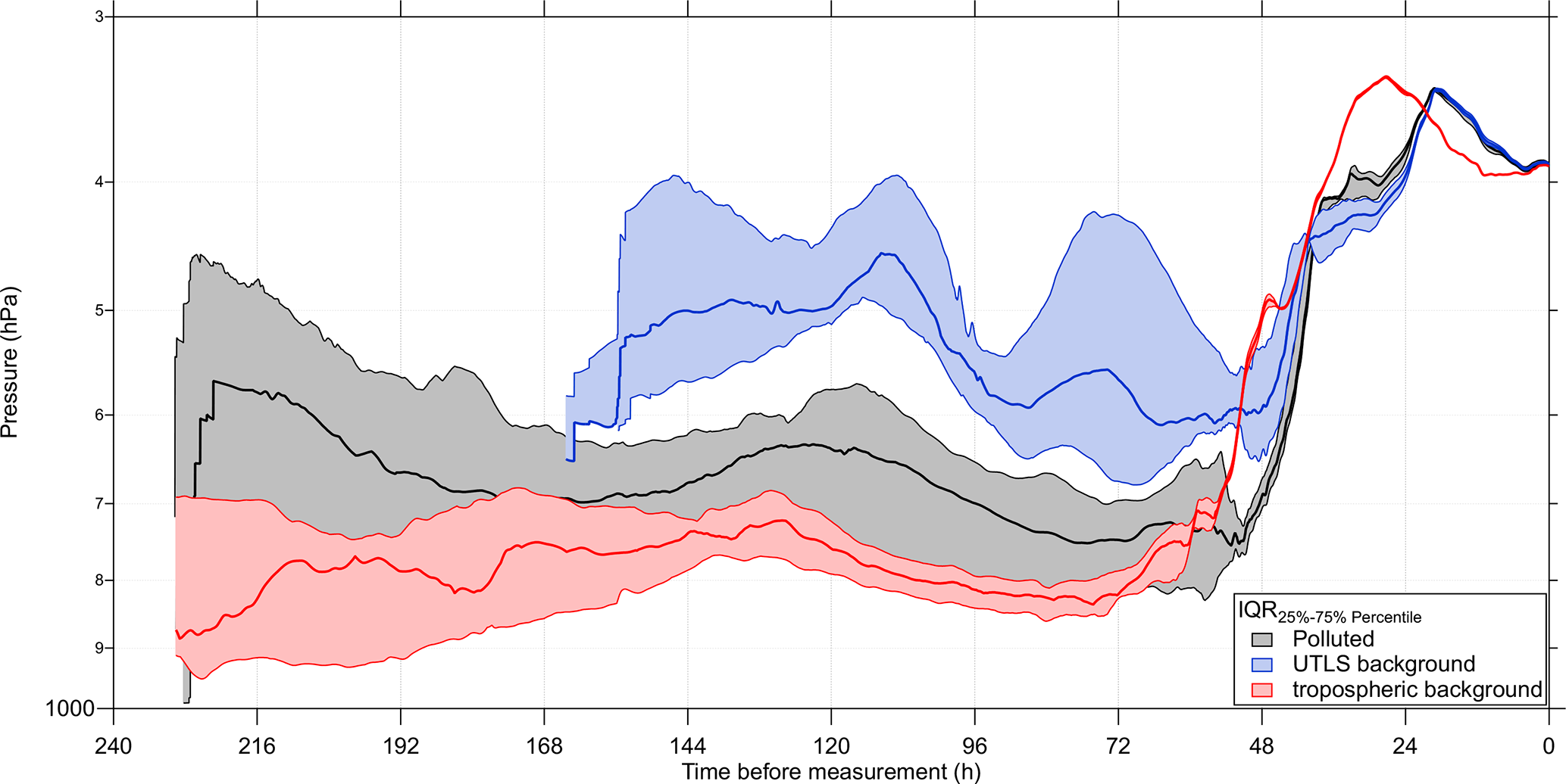Figure 10Time series of pressure for the calculated LAGRANTO trajectories divided into the different regimes (Table C1): Polluted air masses (black), UTLS background (blue) and tropospheric background (red). The shaded area is the interquartile range (IQR) between the 25 % and 75 % percentile with the median as solid line in the middle. The UTLS timeseries is shorter, because the trajectories leave the model domain 7 d before the measurements.