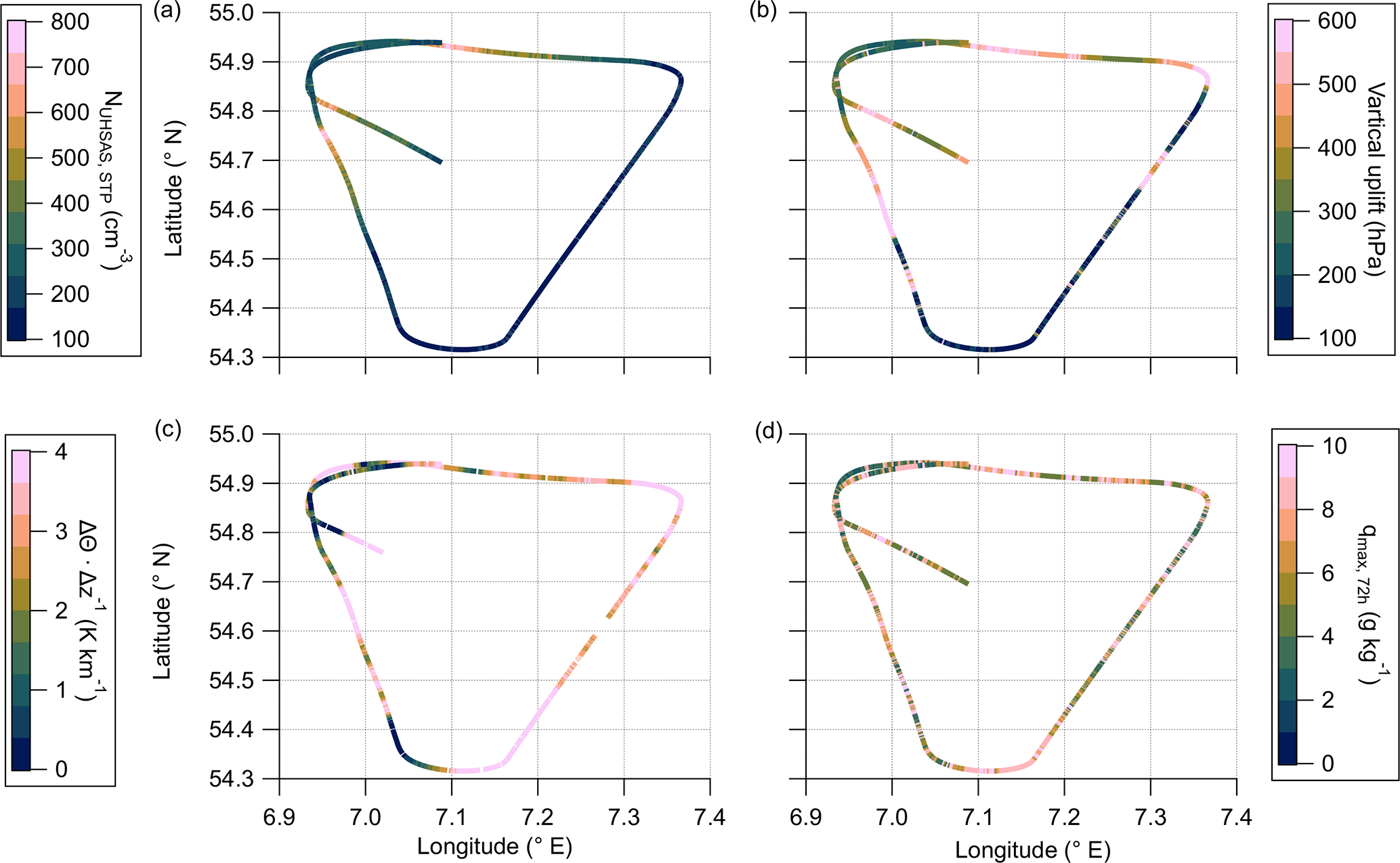 Figure 11Top view of the first flight pattern within the restricted air space with deployed TPC-TOSS during F07. Colorcoded are measured quantities, such as the total aerosol particle number concentration by the UHSAS (a) and the vertical gradient of potential temperature (c). Furthermore, we analyzed meteorological parameters along the trajectories, namely the range between maximum and minium pressure (b) and the maximum specific humidity over the last 72 h before the measurements (d).