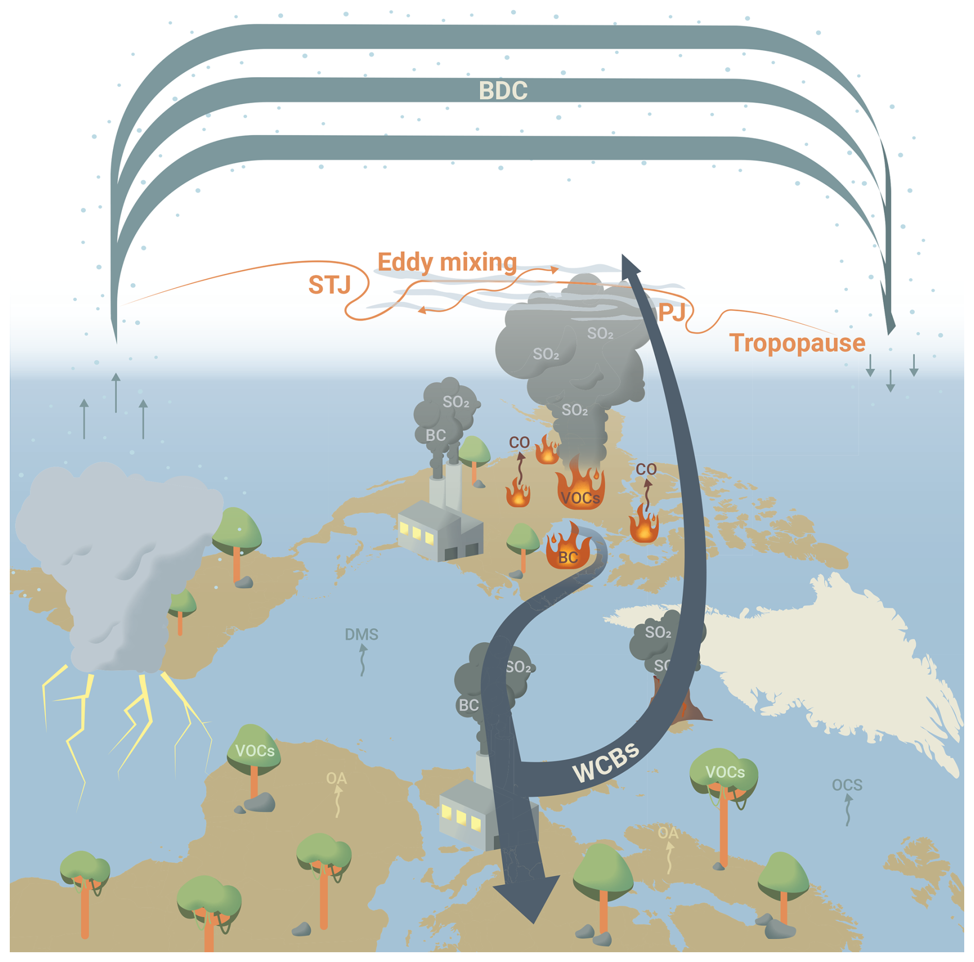 A WCB is part of an extratropical cyclone, which is characterized by the transport of moist air masses over large horizontal distances in combination with a strong ascent into the UT (Harrold, 1973; Heitmann et al., 2024). WCBs can be described from a Lagrangian perspective as a compact trajectory bundle in the vicinity of a cyclone with special characteristics, such as strong ascent and drying of air masses (Heitmann et al., 2024; Schwenk and Miltenberger, 2024). WCBs are capable to transport trace gases, aerosol precursor gases, and aerosol particles from the PBL into the UTLS. Furthermore, WCB transport is able to enhance cross-tropopause mixing by triggering gravity waves, enhancing shear and radiative heating as a consequence of cloud formation. Therefore WCBs can affect the chemical composition of the UTLS (Cooper et al., 2004). Recent studies of WCBs focused on the transport of water vapor (H2O), mineral dust, and the precursor gas sulfur dioxide (SO2) into the tropopause region (Madonna et al., 2014; Marelle et al., 2015; Fromm et al., 2016; Schwenk and Miltenberger, 2024).