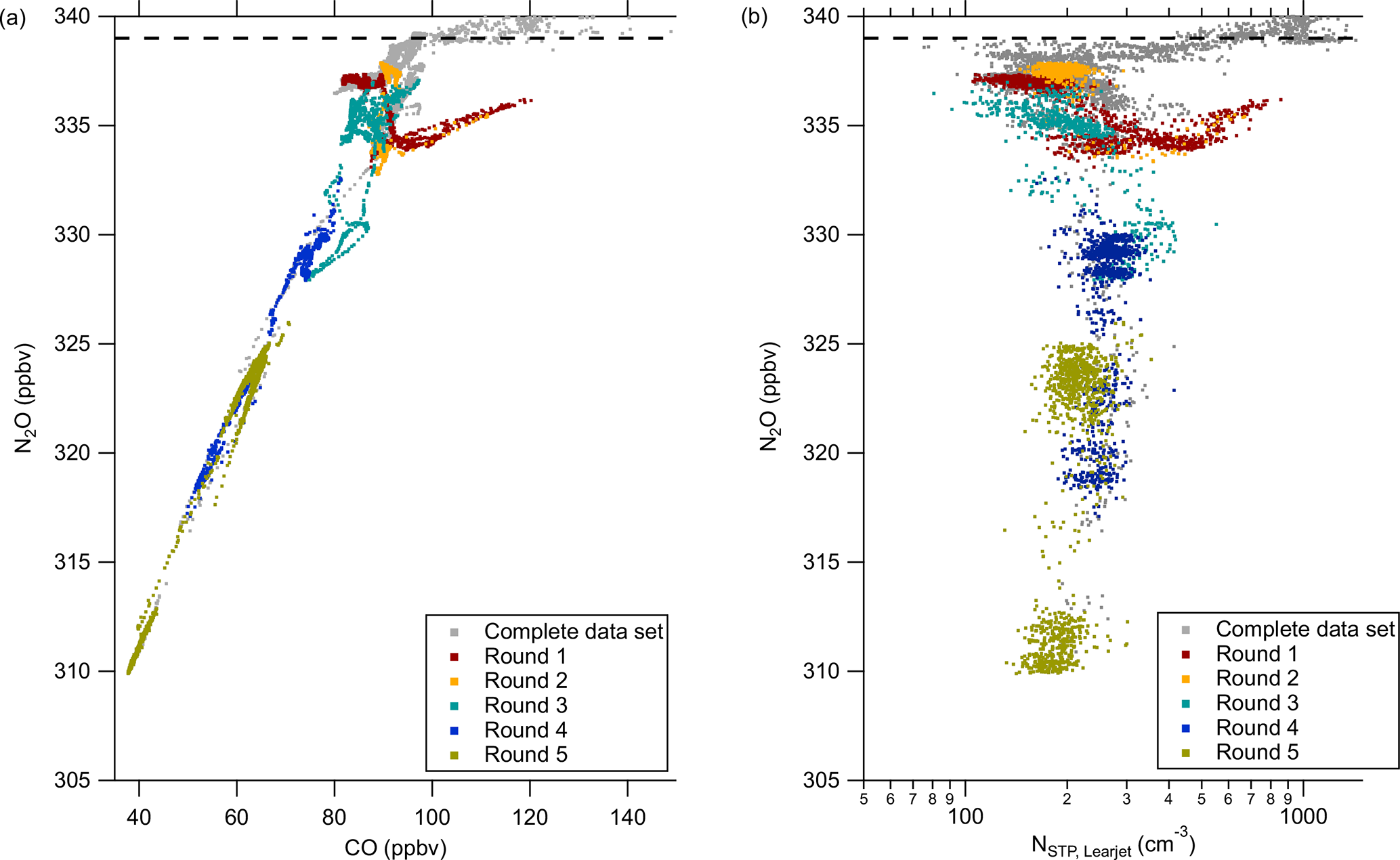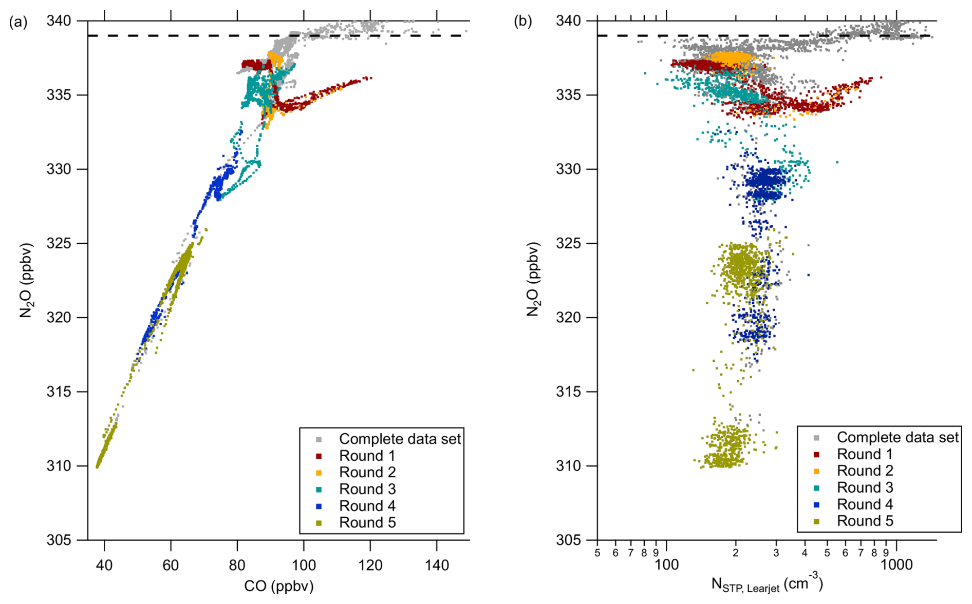 In the correlation between total particle number concentration NUHSAS versus N2O (Fig. B1b), we identify a mirrored “C-shape” over the complete flight, which is also expected from previous studies in literature (e.g., Borrmann et al., 1993). Here, we observe a similar perturbation during the first pattern with particle number concentration exceeding the background values of the correlation and reaching up to tropospheric values.