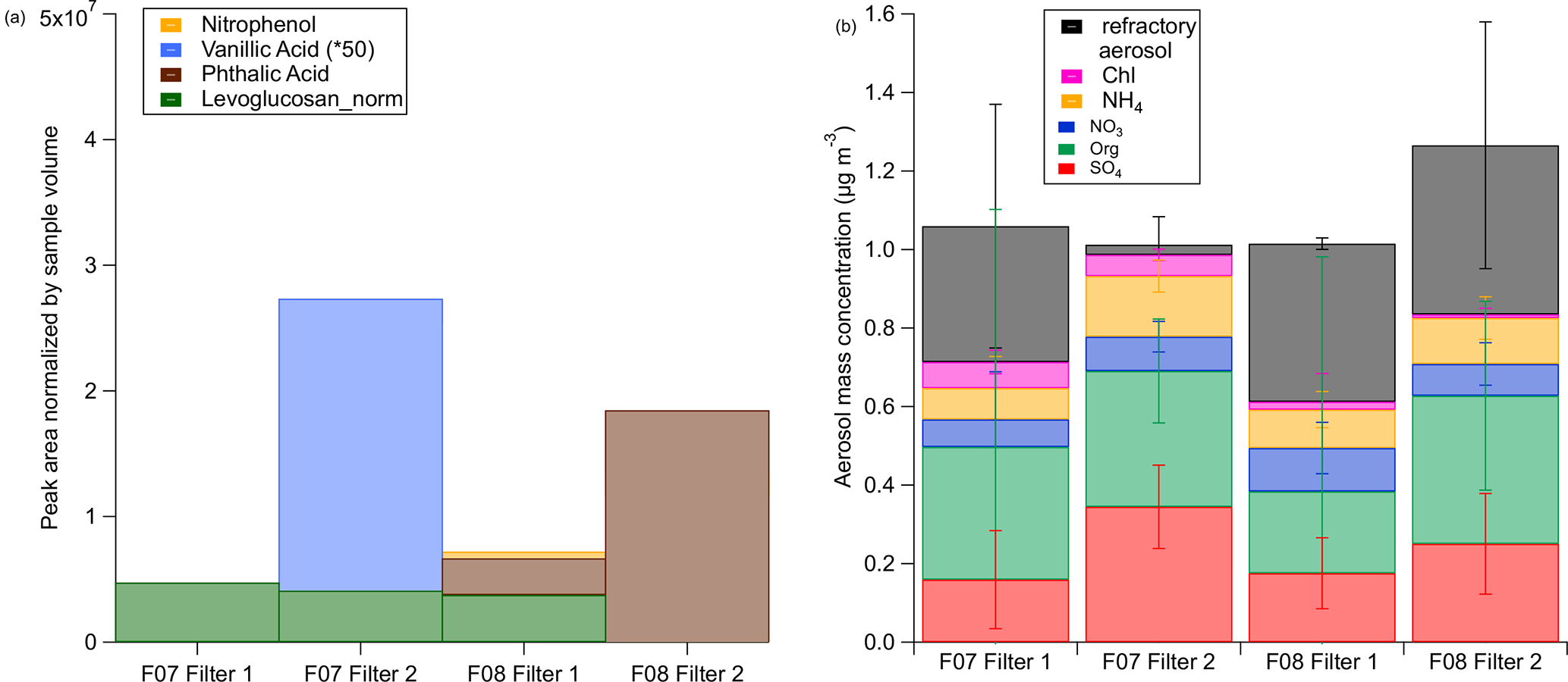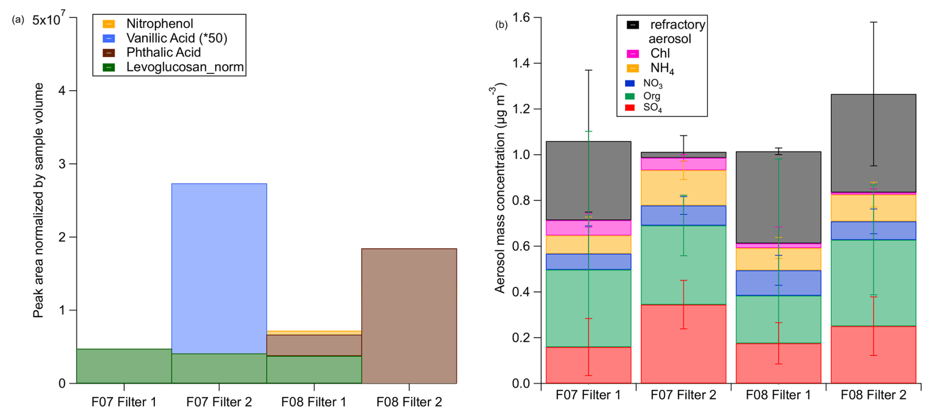 Figure 8Average of the absolute (a) and the relative (b) mass concentrations (including standard deviations shown as error bars) for the non-refractory aerosol species and the estimated amount of refractory aerosol (rA) during different measurement periods during F07. The separation of the regions is done by N2O measurements and the exact times are provided in Table C2.