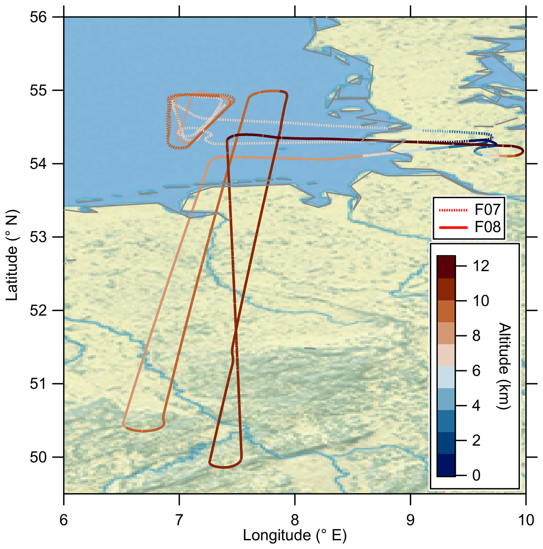 Figure 4 shows the pattern of the first altitude stack at approximately 7400 m (FL240) after the TPC-TOSS deployment. The polluted air masses appear as a small band which is oriented north-eastwards, crossing the flight pattern. Furthermore, the different chemical characteristics of the probed air masses can be seen: While we observe clean and unpolluted tropospheric air masses in the eastern part of the pattern, the western part is characterized by stratospheric air with the polluted streamer embedded.