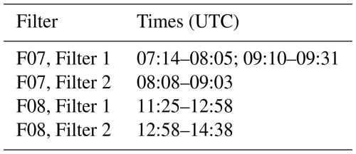 For the analysis of meteorological parameters, we used the ERA5 reanalysis data with a temporal resolution of 1 h and a horizontal grid spacing of 0.3°. Additionally, on the basis of the native variables we calculated meteorological parameters such as vertical wind shear (S2), static stability (squared Brunt-Vaisala frequency, N2), potential vorticity (PV) and equivalent latitude (EQLAT) (e.g., Lary et al., 1995; Krause et al., 2018; Joppe et al., 2024). In order to gain additional information about the chemical composition of the UTLS, we used the forecast data of the Copernicus Atmosphere Monitoring Service (CAMS), which is based on the Integrated Forecasting System 48r1 (IFS) with additional chemical modules for the chemical analysis, such as aerosol, reactive gases and greenhouse gases. This forecast is available twice a day (00:00 and 12:00 UTC) with a horizontal resolution of 40 km and 137 vertical levels (e.g., Benedetti et al., 2009; Morcrette et al., 2009; Rémy et al., 2019). We interpolated the CAMS data onto the flight tracks as we did for the ERA5 data. For analyses of air mass origin, we calculated backward trajectories from the position of the Learjet with LAGRANTO (Sprenger and Wernli, 2015) based on combined ICON global operational analysis and forecasts. We used the ICON global model for the trajectories instead of ERA5 to make use of the higher horizontal resolution. ICON global analysis is available every 6 h and is combined with short-term forecast to achieve an hourly resolution of wind field data. ICON global analysis and forecast data are available on a native R03B07 grid (corresponding to about 13.5 km effective grid spacing) and has been re-gridded to a regular longitude-latitude grid with 0.15° spacing. In the vertical, ICON global data comprises 120 levels with a spacing of about 300 m between about 4 and 13 km altitude. The trajectories are calculated 10 d back in time. In addition, we combined the backward trajectories with the CAMS Global Fire Assimilation System (GFAS) version 1.2 to check if the trajectories crossed potential biomass burning regions. GFAS assimilates fire radiative power (FRP) on basis of satellite measurements to give daily estimates for biomass burning locations (Kaiser et al., 2012; Rémy et al., 2017). The fire locations are taken from the GFAS data set with detected fire radiative power signals in cloud-free regions and reports by the Canadian Wildland Fire Information System (CWFIS, https://cwfis.cfs.nrcan.gc.ca/interactive-map, last access: 9 January 2025) in order to close the gap of the satellite retrievals in regions with clouds.