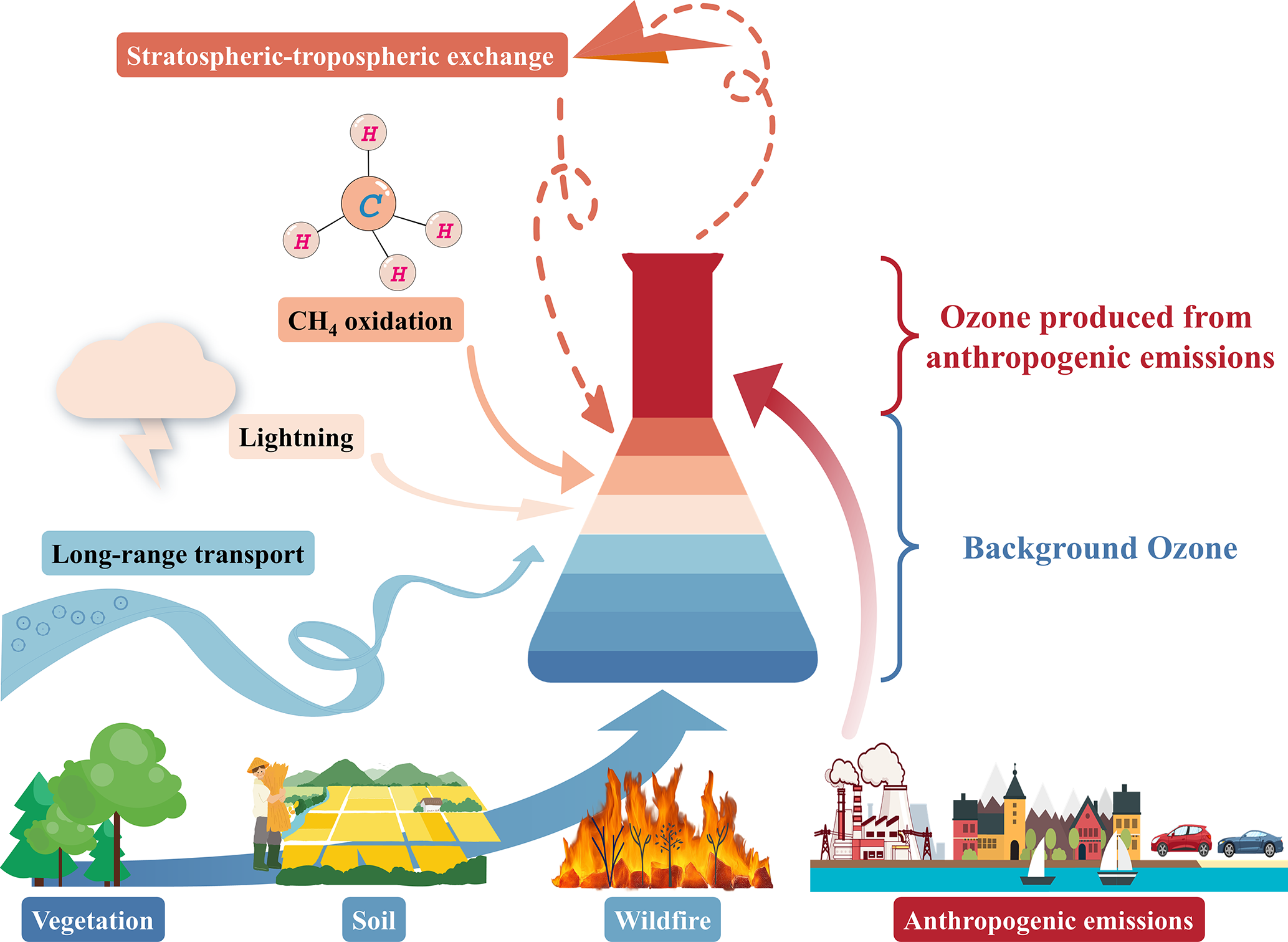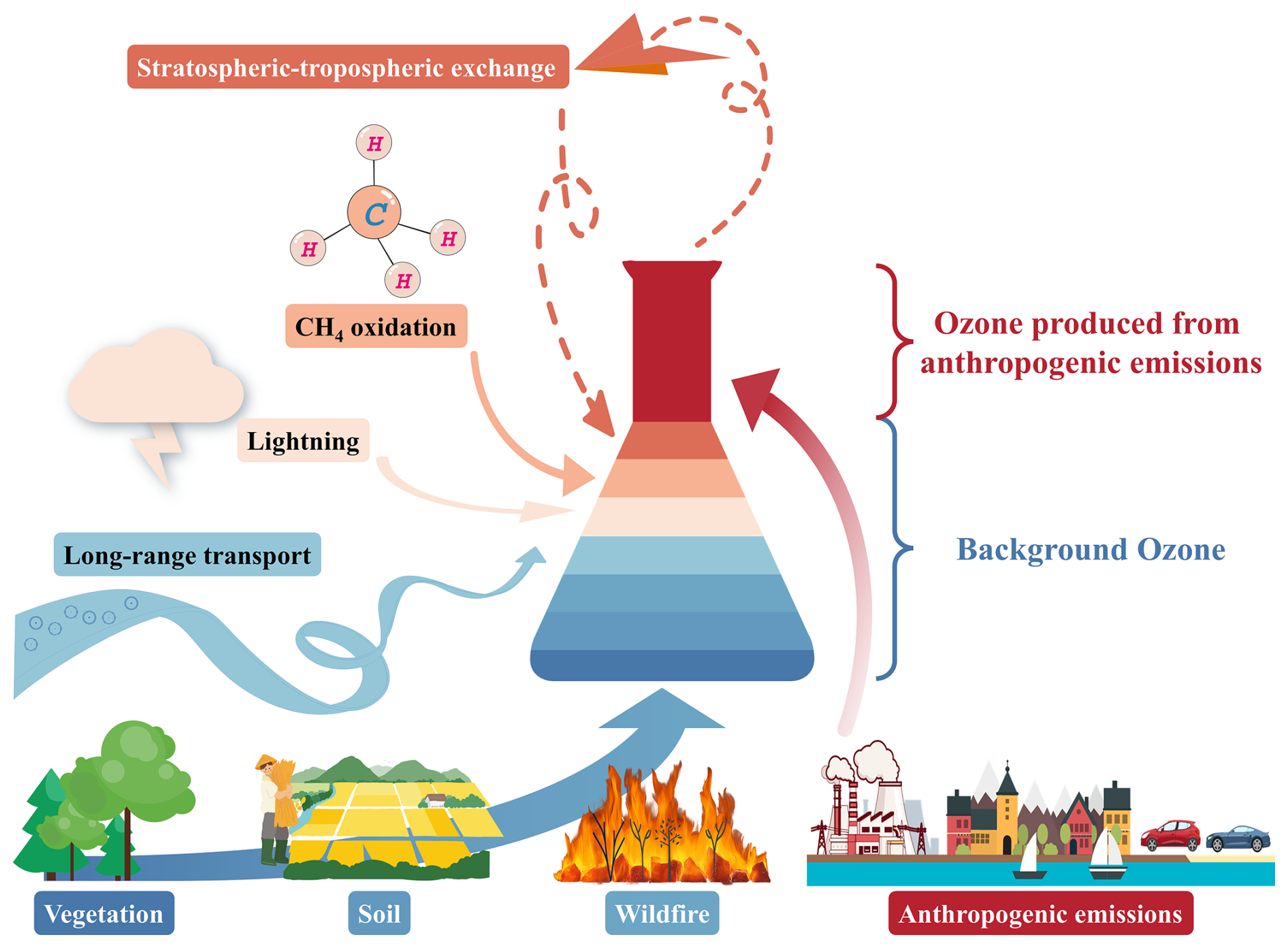 Tropospheric O3 is a secondary pollutant formed through photochemical reactions involving volatile organic compounds (VOCs) and nitrogen oxides (NOx). It consists of two components: locally produced O3 from anthropogenic emissions and background O3, both of which impact human health, ecological ecosystems, and agricultural productivity (McDonald-Buller et al., 2011; Wang et al., 2009b). Background O3 refers to the O3 concentration present in the absence of local anthropogenic precursor emissions. It originates from a variety of natural and non-local processes, including methane (CH4) oxidation, stratosphere–troposphere exchange (STE), vegetation, soil, lightning, wildfires and long-range pollutants transport, as shown in Fig. 1 (Dolwick et al., 2015; Thompson, 2019). Among these sources, CH4 is unique due to its long atmospheric lifetime (8–9 years) and globally well-mixed distribution (Fiore et al., 2002b; Vingarzan, 2004; West and Fiore, 2005; Thompson, 2019). In the pre-industrial era (∼ 1750), natural CH4 sources (e.g., wetlands, inland waters, geological emissions) contributed ∼ 95 % of global emissions (Lassey et al., 2000; Prather et al., 2012; Valdes et al., 2005), making CH4 oxidation a stable background contributor to tropospheric O3 (Skipper et al., 2021; Sun et al., 2024; Thompson, 2019; Vingarzan, 2004; Wu et al., 2008). However, over the past century, anthropogenic CH4 emissions from agriculture, fossil fuels, and waste have increased substantially, accounting for over 60 % of global CH4 by 2012 (Fiore et al., 2002b; Jackson et al., 2024; Kirschke et al., 2013; Lelieveld et al., 1998; Saunois et al., 2016). This transition challenges the traditional classification of CH4-driven O3 as part of the “background,” and calls for a more precise attribution that excludes anthropogenic CH4 from background O3 estimates. Differentiating natural from anthropogenic CH4 contributions is thus crucial for improving the accuracy and policy relevance of background O3 assessments.