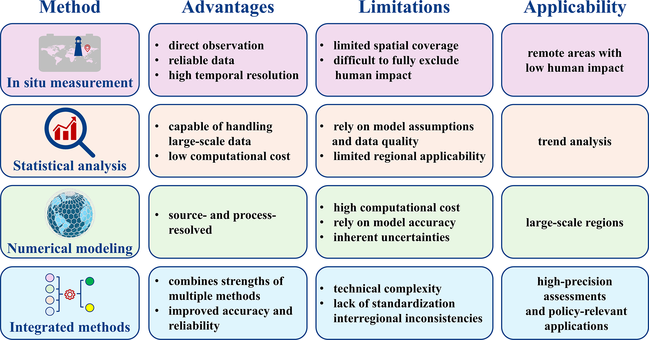The estimation of regional background O3 is typically conducted using four primary methods: (1) in situ measurement estimation, (2) statistical analysis estimation, (3) numerical modeling estimation, and (4) integrated methods estimation. Figure 3 summarizes the advantages, limitations, and applicability of each method, providing a comparative overview of their respective strengths and weaknesses.