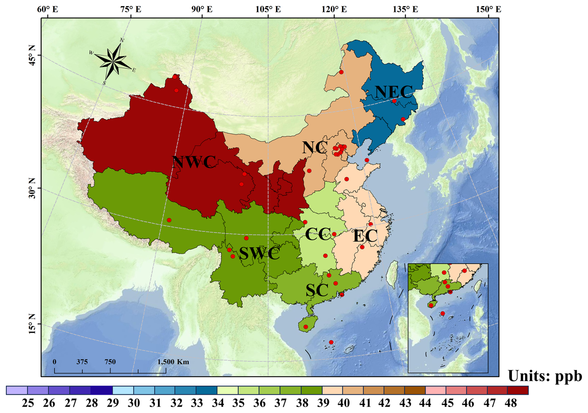 Figure 4Spatial distribution of background O3 concentrations (1994–2020) across various regions of China. The locations of 33 background monitoring stations are indicated with red dots. The seven regions include Northeast China (NEC), North China (NC), East China (EC), Central China (CC), Northwest China (NWC), Southwest China (SWC), and South China (SC).