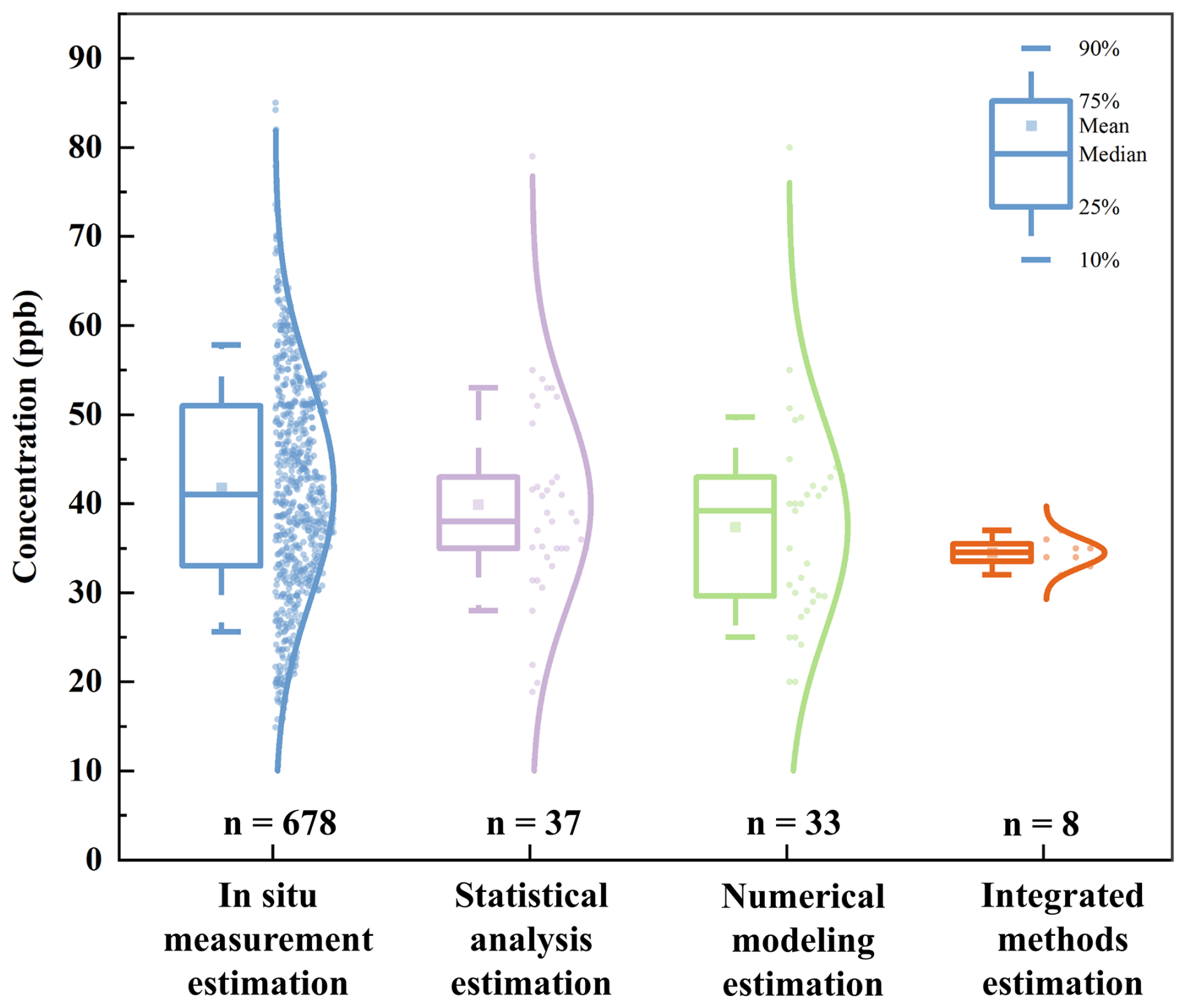 Despite similar mean values, the variability across methods is substantial. In situ measurement estimation reveals a particularly wide variability, with estimated background O3 concentrations ranging from approximately 14 ppb to as high as 85 ppb. This broad range reflects the substantial influence of localized factors, such as topography, climatic conditions, and anthropogenic emissions, on observational data. In comparison, statistical analysis estimation and numerical modeling estimation methods yield relatively consistent results, although the difference between the maximum and minimum estimated background O3 concentration for both methods reaches 60 ppb. Notably, more than 80 % of the estimated background O3 concentrations fall within the range of 25–53 ppb, suggesting a reasonable degree of agreement between the two methods. The consistency is likely attributable to the reliance on long-term data trends and calibrated algorithms, which effectively reduce the impact of extreme values while capturing broader patterns in O3 behavior.