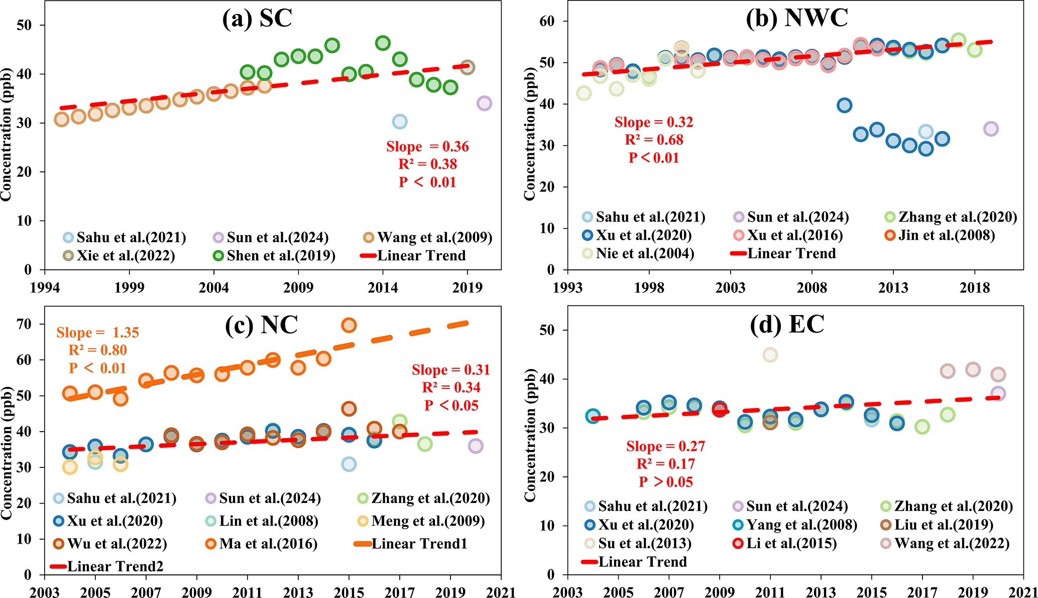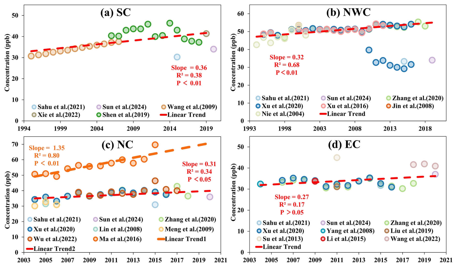 Due to the absence of long-term background O3 records for other regions, Fig. 6 focuses on the annual variation trends of background O3 concentrations in four regions of China – South China (SC), Northwest China (NWC), North China (NC), and East China (EC) – during the period from 1994 to 2020. Overall, background O3 concentrations have exhibited an upward trend across these regions, though the magnitude and significance of the trends vary regionally.