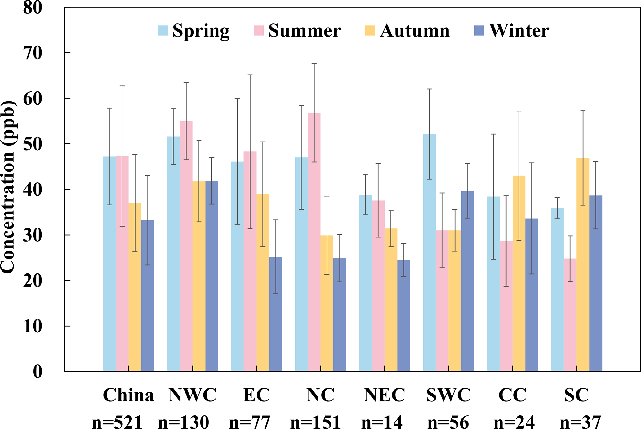 The urban clusters of North China (NC) and East China (EC), along with Southwest China (SWC), also exhibit higher background O3 concentrations, averaging 40.3 ± 14.9, 39.0 ± 13.4, and 38.4 ± 10.4 ppb, respectively. These concentrations account for 75 %, 67 %, and 83 % of the MDA8 O3 concentration in each respective region. East China (EC) and North China (NC) are heavily influenced by high industrial and vehicular emissions, which release significant quantities of NOx and VOCs. The precursors undergo photochemical reactions under intense sunlight and elevated summer temperatures, resulting in higher O3 levels. Moreover, the East Asian Summer Monsoon (EASM) facilitates the transport of O3 and its precursors from low-latitude regions, such as South China (SC), to higher latitudes, exacerbating O3 pollution during the monsoon season (Gao et al., 2005; Liu et al., 2019, 2021; Sun et al., 2016; Xu et al., 2011, 2020). In contrast, in Southwest China (SWC), regional pollutant transport plays a significant role. During spring, prevailing winds carry pollutants such as NOx and VOCs from Southeast Asia, intensifying local O3 levels (Ye et al., 2024). Summer conditions – characterized by high humidity, elevated temperatures, and intense solar radiation – further amplify photochemical O3 formation (Chen, 2020). The region's complex topography, including mountainous areas and plateaus, also contributes to localized O3 accumulation. For instance, the Sichuan Basin, with its basin-like terrain, impedes air mass dispersion, leading to pollutants entrapment and prolonged O3 buildup (Hu et al., 2019).
