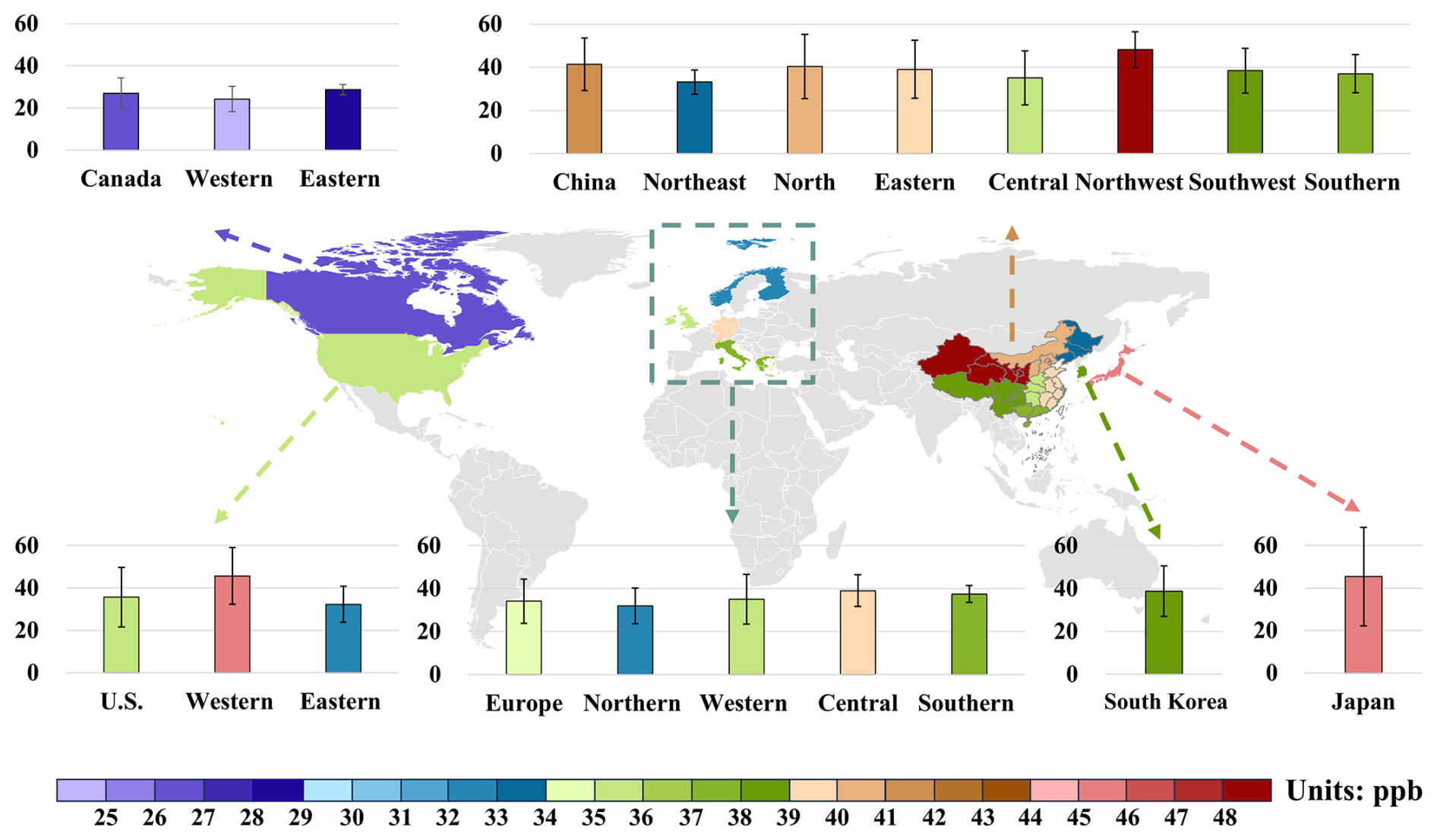 For instance, Dolwick et al. (2015) improved model-based estimates of background O3 by comparing observed and simulated O3 concentrations. Their analysis of rural areas in the western U.S. during April to October 2007 reported background O3 concentrations ranging from 40 to 45 ppb, with the lowest concentrations observed along the Pacific coast, ranging from 25 to 35 ppb.