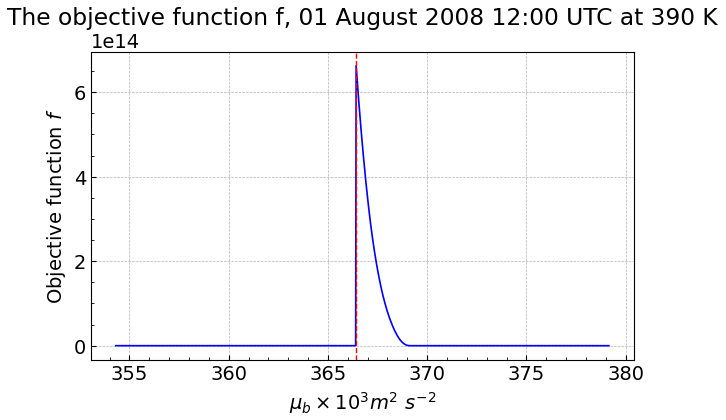 Figure 2The objective function depending on the background value μb for 6 September 2008 at 390 K with high MSF values observed outside of the box. The maximum around is the optimized background value.