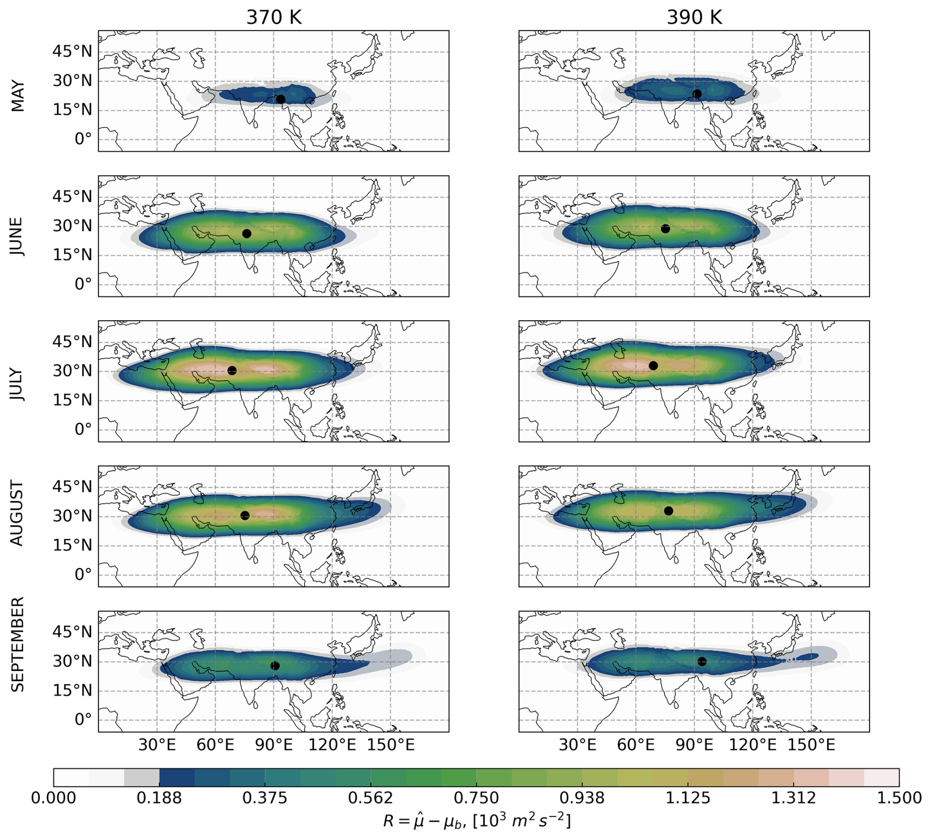 Figure 4Mean residual MSF for 1980–2023 for the Asian monsoon anticyclone (the difference between MSF values and the background value) for each individual month from May to September (rows) at 370 and 390 K (columns).