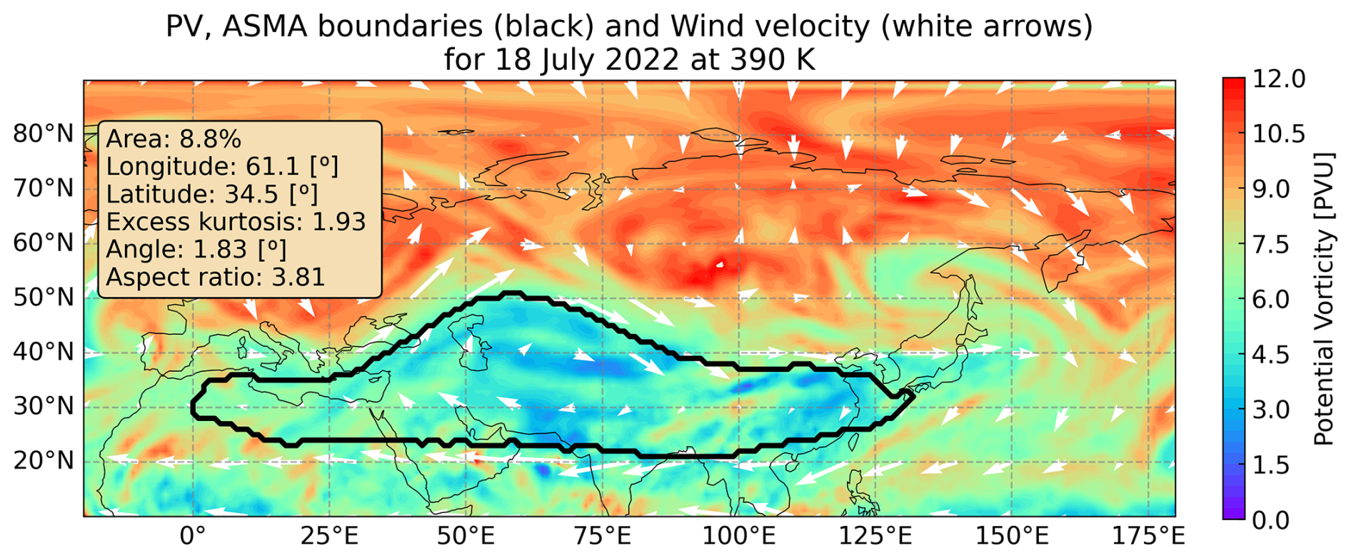 Figure 6Horizontal plot of the ASMA boundaries (thick black line), potential vorticity (color map), wind velocity (arrows), and corresponding moments quantities for 18 July 2022 at 390 K.