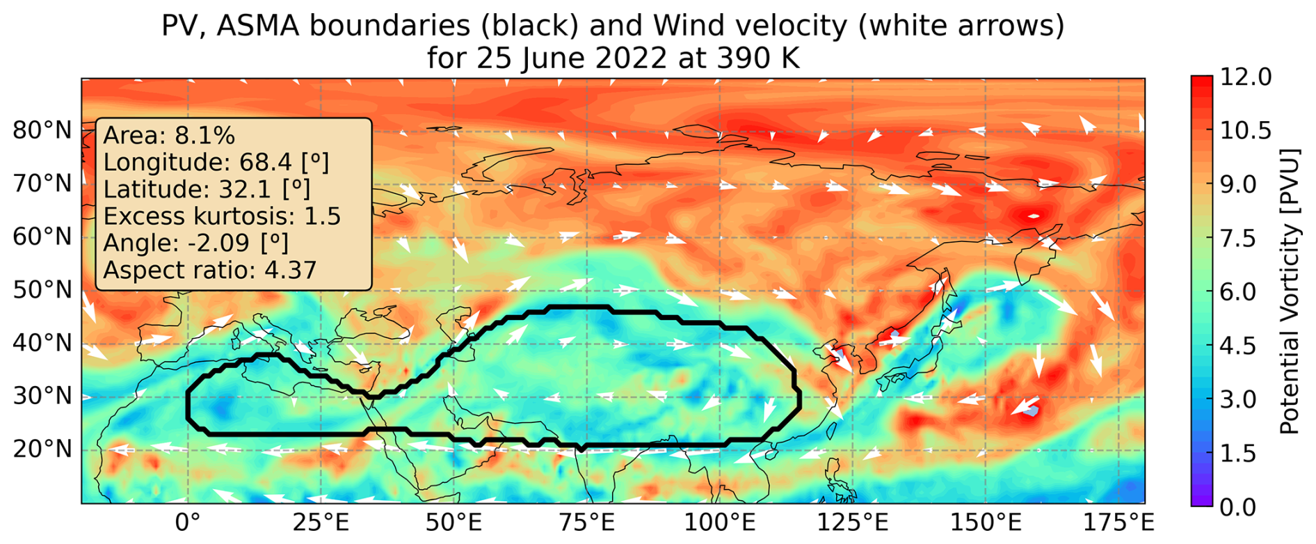 Figure 7Horizontal plot of the ASMA boundaries (thick black line), potential vorticity (color map), wind velocity (arrows), and corresponding moments quantities for 25 July 2022 at 390 K.