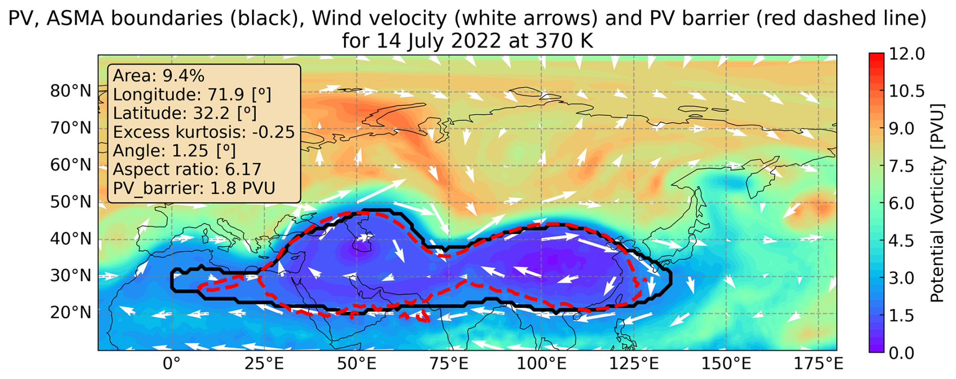 Figure 8Horizontal plot of the ASMA boundaries (thick black line), potential vorticity color map (PV_MEAN as defined in Ploeger et al., 2015), wind velocity (arrows), PV barrier (red dashed line), and corresponding moments quantities for 14 July 2022 at 370 K.