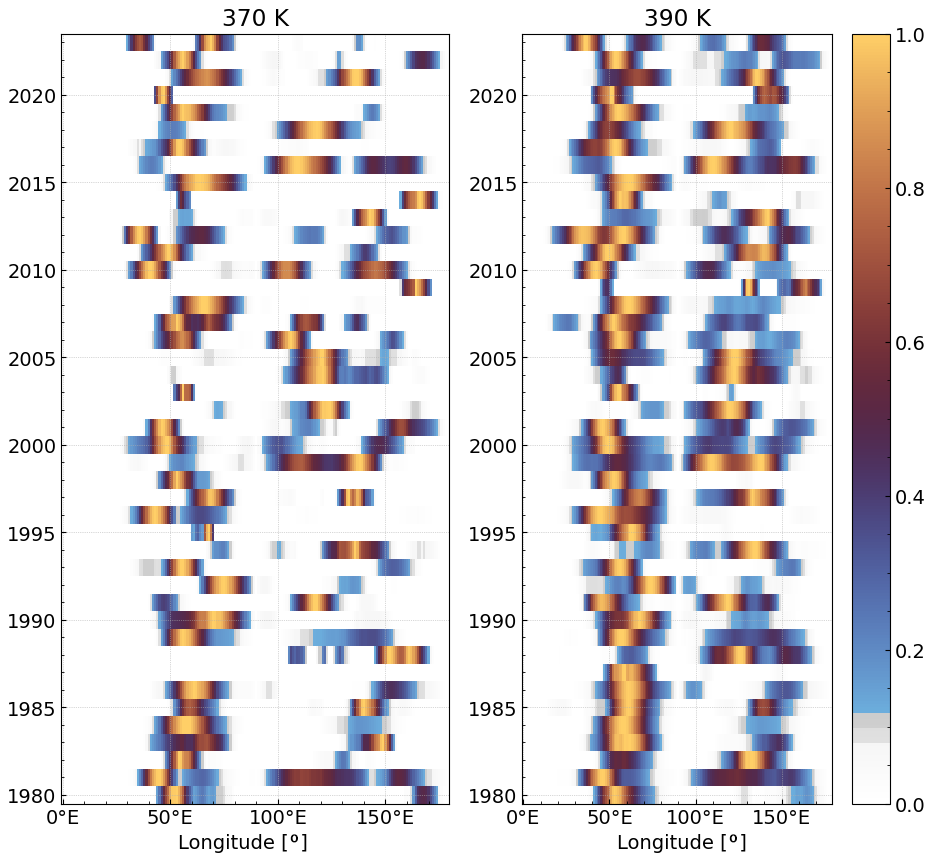 Figure 9Mean JJA Hovmöller diagram of normalized zonal mean (15–45° N) of the residual MSF for 1980–2023 period at 370 and 390 K. Bright colors indicate where the maximum residual MSF values tend to cluster.