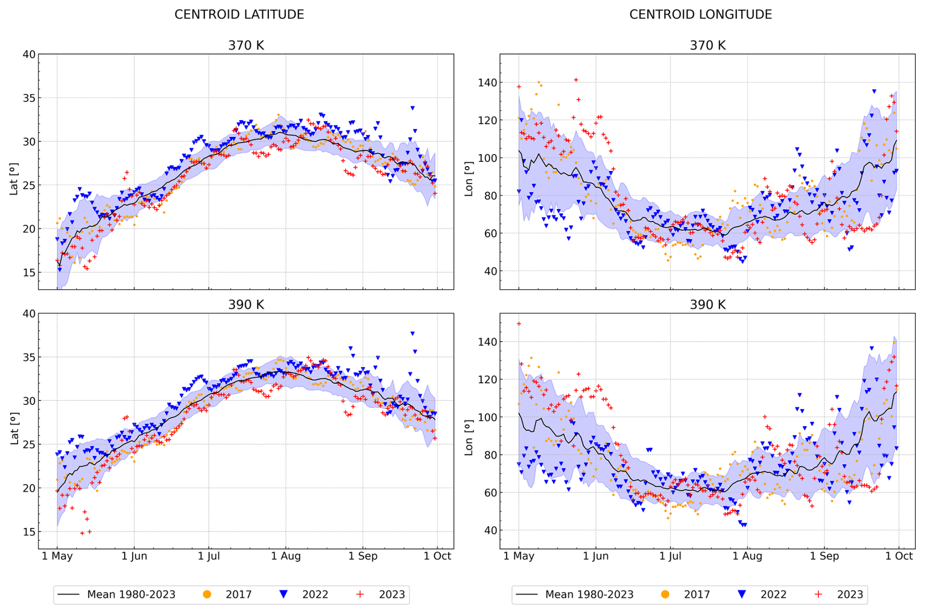 Figure 11Climatological (1980–2023) time-series (black line) of the centroid position of the ASMA latitude (left hand side) and longitude (right hand side), and individual years of 2017 (yellow dots), 2022 (blue downward-pointing triangle), and 2023 (red plus) at 370 K and 390 K. The lavender background denotes the standard deviation of the climatological data.