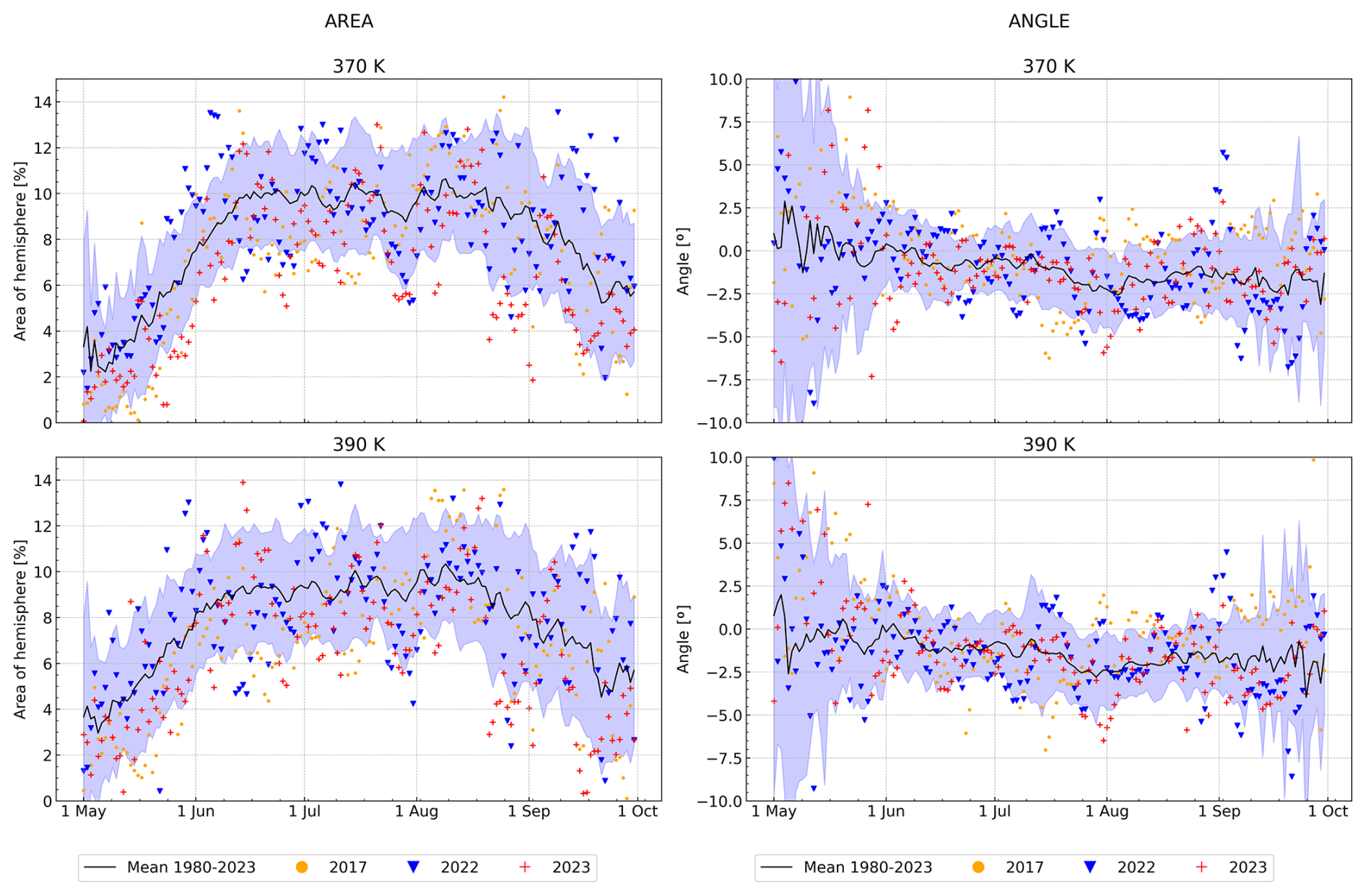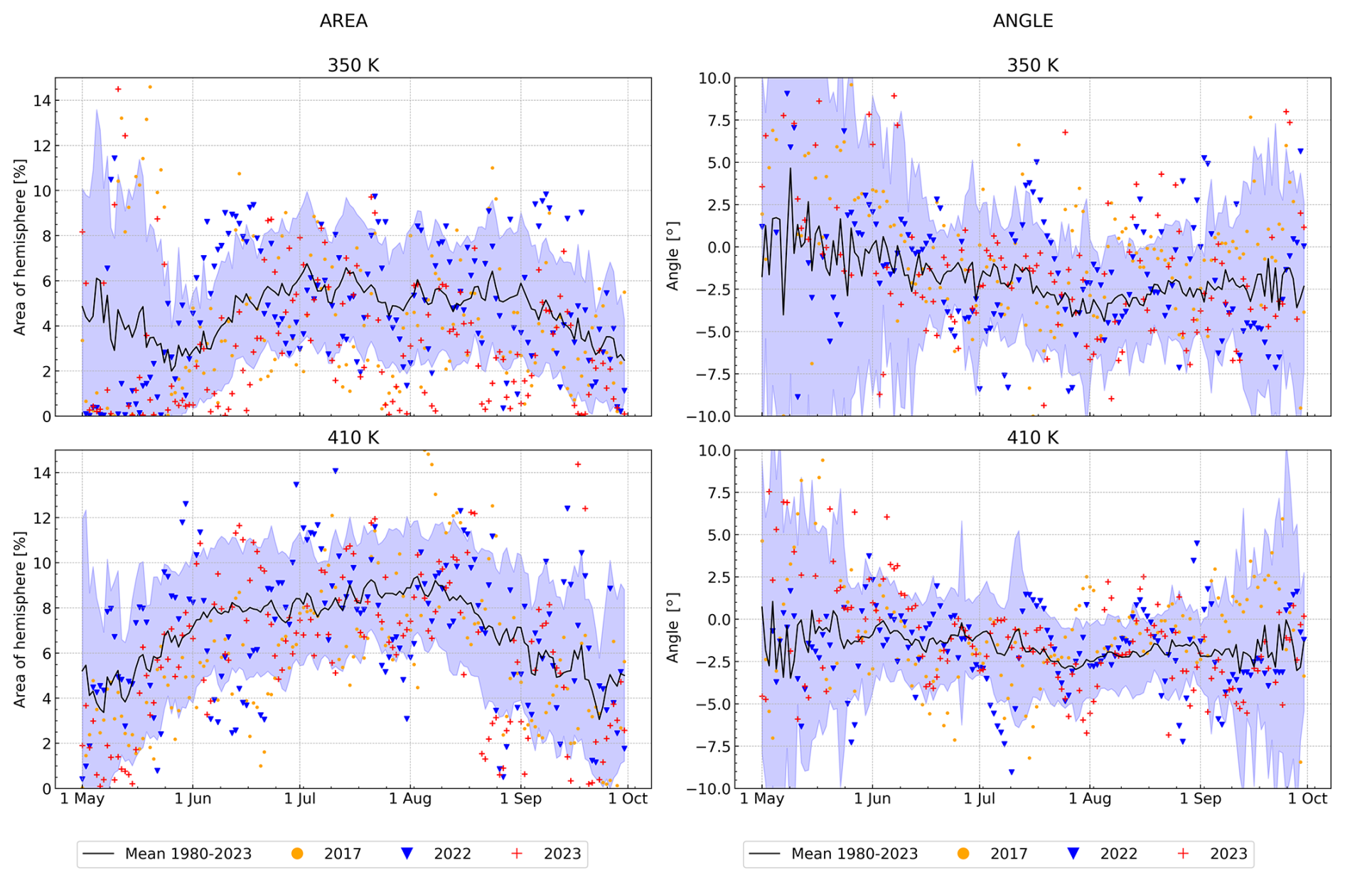Figure D2Climatological (1980–2023) time-series (black line) of the ASMA area (left hand side) and angle (right hand side), and individual years of 2017 (yellow dots), 2022 (blue downward-pointing triangle), and 2023 (red plus) at 350 and 410 K. The lavender background denotes one standard deviation of the climatological data.