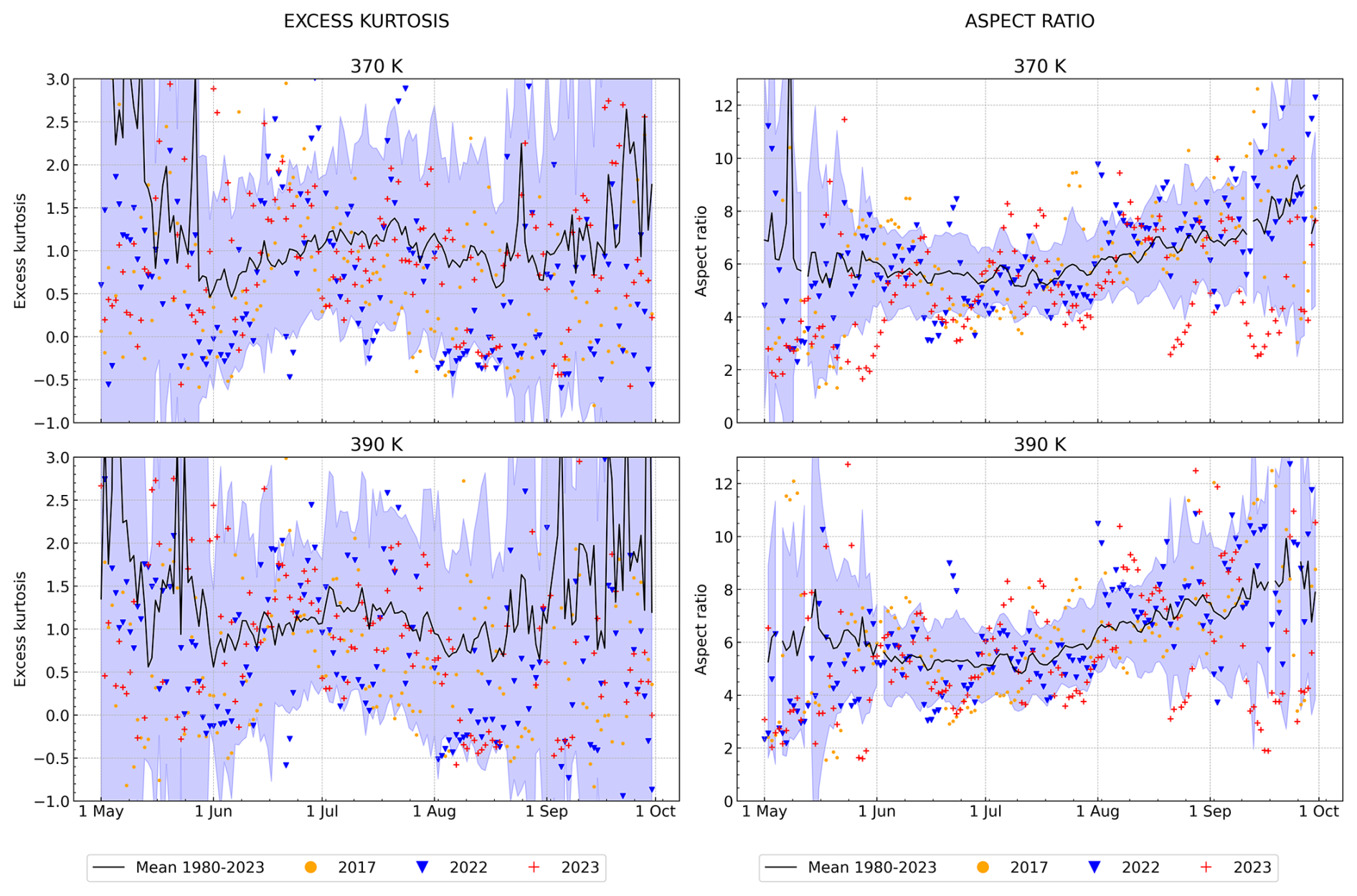 Figure 13Climatological (1980–2023) time-series (black line) of the ASMA excess kurtosis (left hand side) and aspect ratio (right hand side), and individual years of 2017 (yellow dots), 2022 (blue downward-pointing triangle), and 2023 (red plus) at 370 and 390 K. The lavender background denotes the standard deviation of the climatological data.