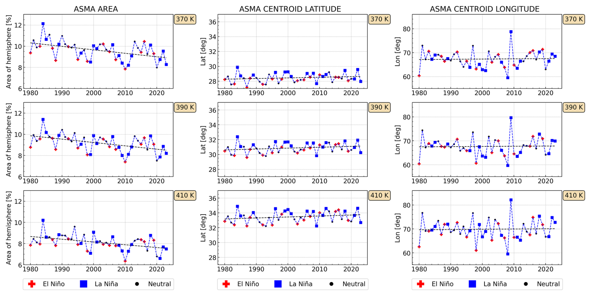 Interannual trends for 1980–2023 were determined for the anticyclone's area, centroid latitude and longitude. The area shows a decline over this period for all vertical levels. This results contradicts previous studies and is caused by the method itself; an impact of the used reanalysis could be excluded. Our findings show that the ASMA centroid position depends on ENSO. During El Niño (La Niña) years, the ASMA centroid is somewhat shifted towards the east (west) and to the tropics (mid-latitudes). This issue needs to be analysed in more depth in further studies.