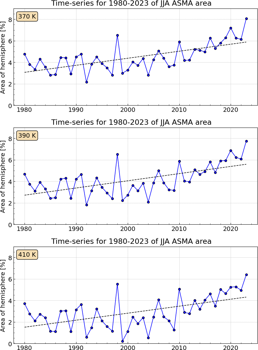 The area of the ASMA (Fig. 12, left) is increasing during its development until mid-June, stays nearly constant in its peak-phase and starts to decrease end of August. In May the area of the ASMA is only about 2 % of the area of the hemisphere and then gradually starts to increase. The steepest rise is seen at 370 K during mid of May. During the ASMA peak phase between June and September the ASMA area stays roughly the same at level of 10 % of the hemisphere at 370, 390, and 410 K. At the beginning of September the area starts to decrease at 370 and 390 K, for 410 K the process starts earlier – in August.