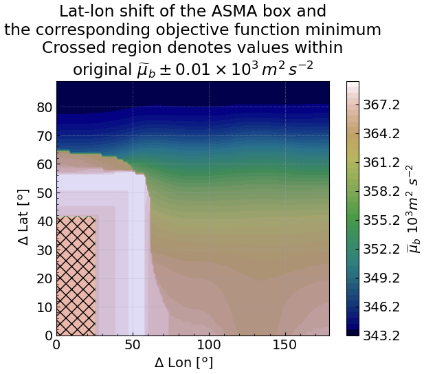 As was mentioned earlier, the ASMA box was defined as a region of ASMA occurrence and its position was introduced on our empirical knowledge where the Asian summer monsoon anticyclone can be found. To ensure that our approach is robust to adjustment of the latitude-longitude box position we apply a sensitivity analysis. The strategy is as follows: using Eq. (4) we consider one specific but instead adjusting the ASMA box position by 1° starting from (0–90° N, 0–180° E) until (−90° S–0° N, 180° E–1° W) and retrieving for each ASMA box. Figure B1 shows a distribution of the with corresponding latitude-longitude shift. ΔLon, ΔLat axes show how many degrees are added to the ASMA box. As can be seen, the crossed region marks the range of step-sizes in degree that can be added to the ASMA box while preserving the original (using the ASMA box from the methodology). The range of ΔLon, ΔLat are within 0–20° to the south and 0–40° to the east confirming that our approach is robust relative to a fluctuation of the position of the ASMA box.