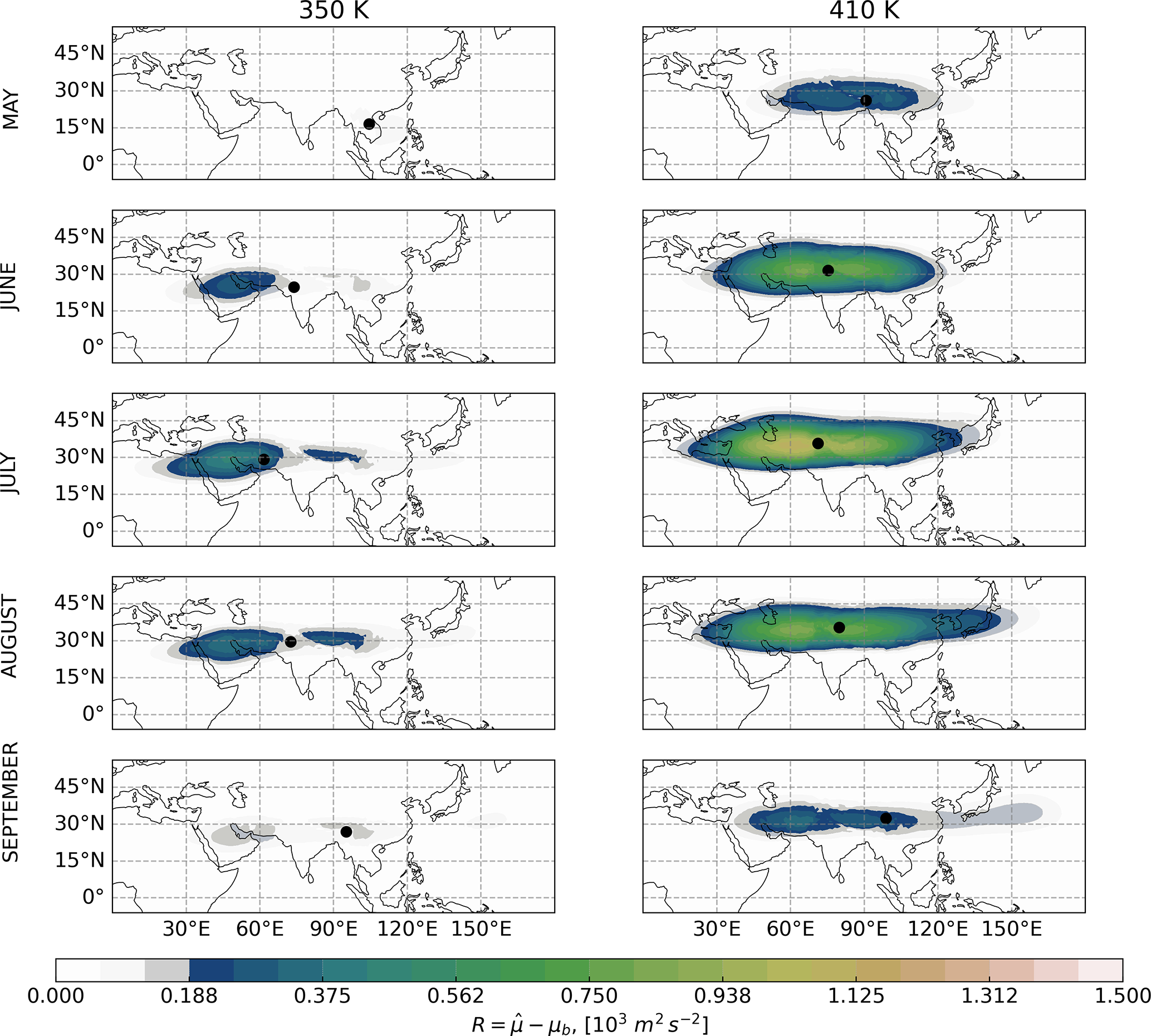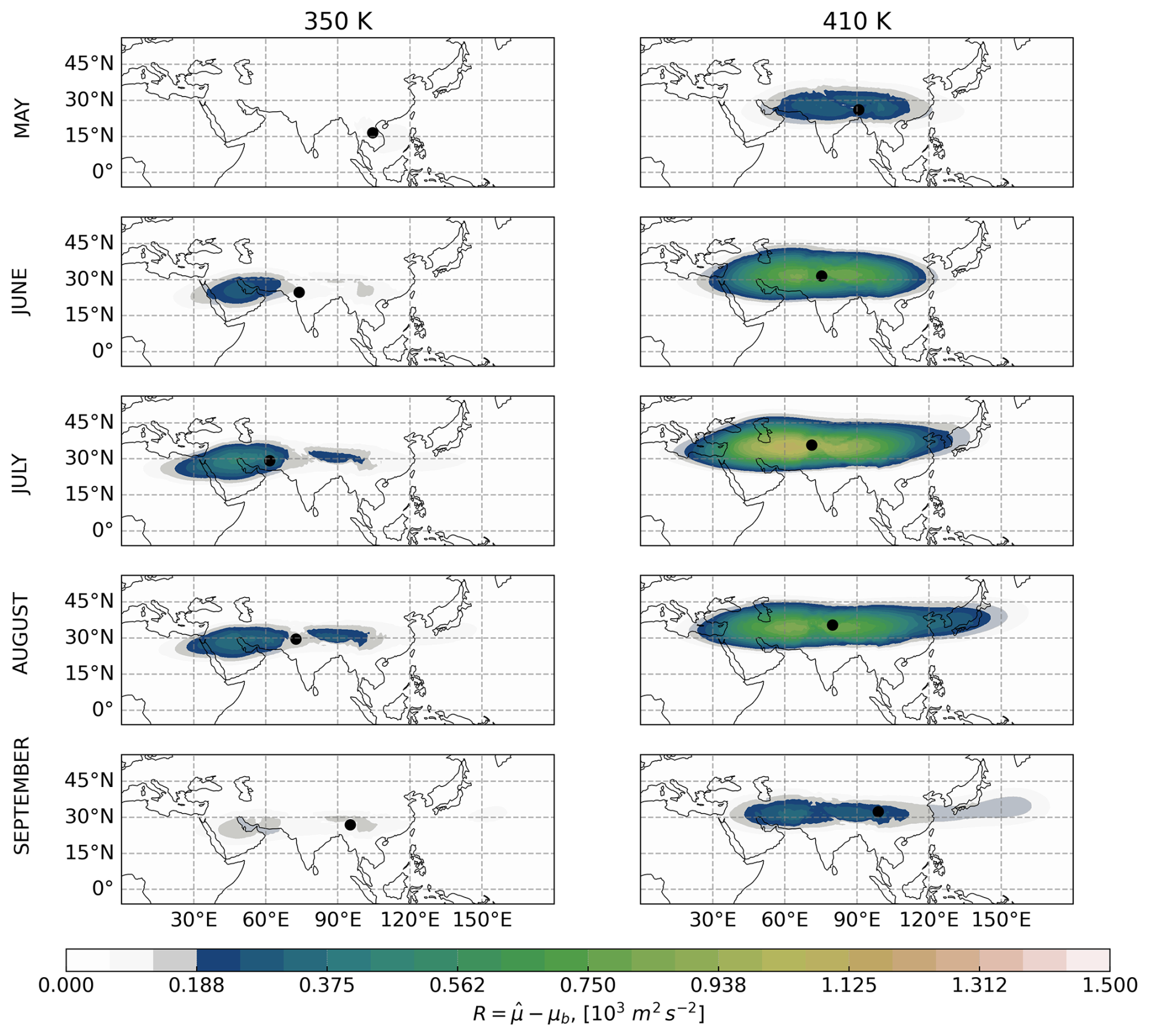Figure 4 shows that during May the ASMA starts to develop and settles over South Asia at 370, 390, and 410 K (shown in Fig. C1 in the Appendix). At 350 K (Fig. C1 in the Appendix), only a very weak anticyclone is indicated and temporarily separated into two parts demonstrating that the main ASMA is above 350 K.