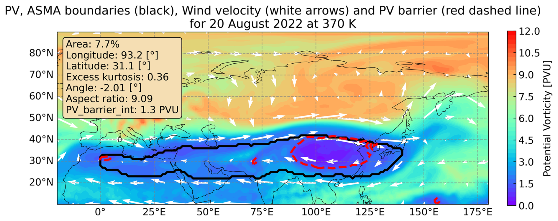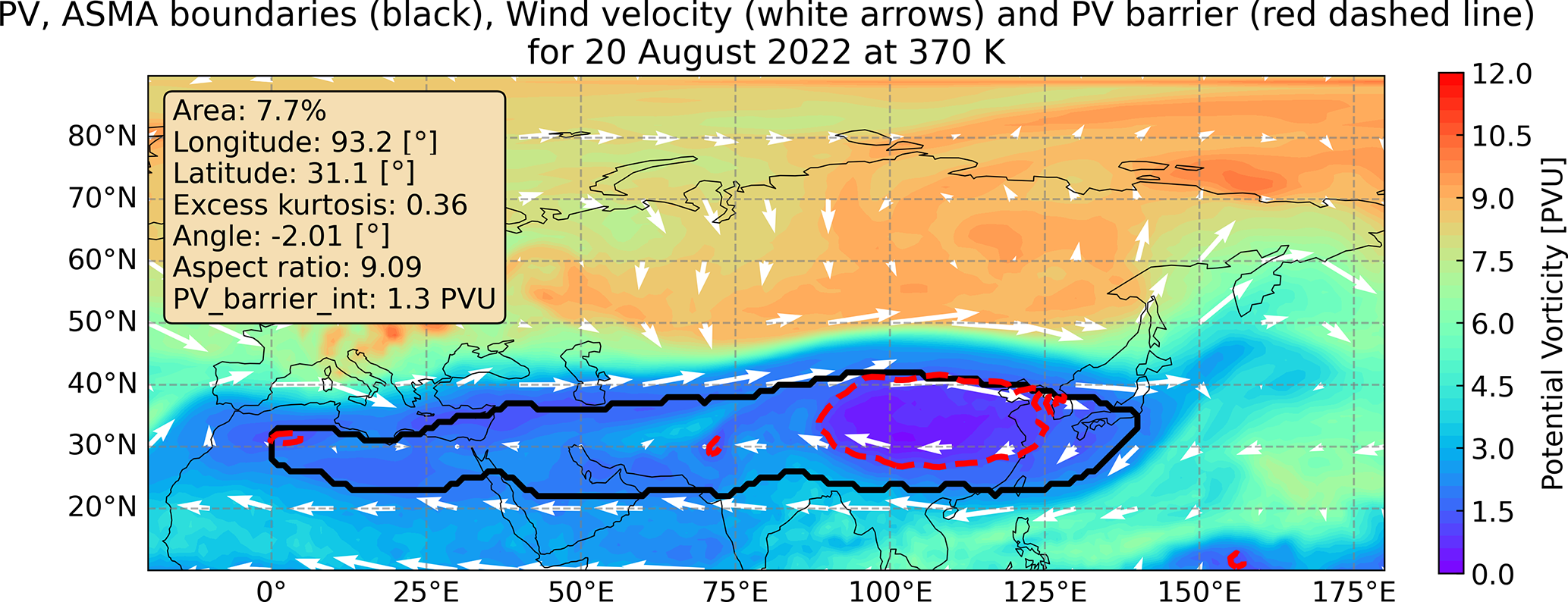 Figure C2Horizontal plot of the ASMA boundaries (thick black line), potential vorticity color map (PV_MEAN as defined in Ploeger et al. (2015)), wind velocity (arrows), interpolated PV barrier (red dashed line) and corresponding moments quantities for 20 August 2022 at 370 K.