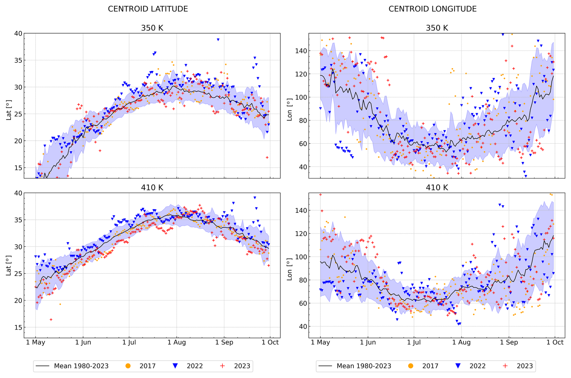 Figure D1Climatological (1980–2023) time-series (black line) of the ASMA centroid latitude (left hand side) and longitude (right hand side), and individual years of 2017 (yellow dots), 2022 (blue downward-pointing triangle), and 2023 (red plus) at 350 and 410 K. The lavender background denotes one standard deviation of the climatological data.