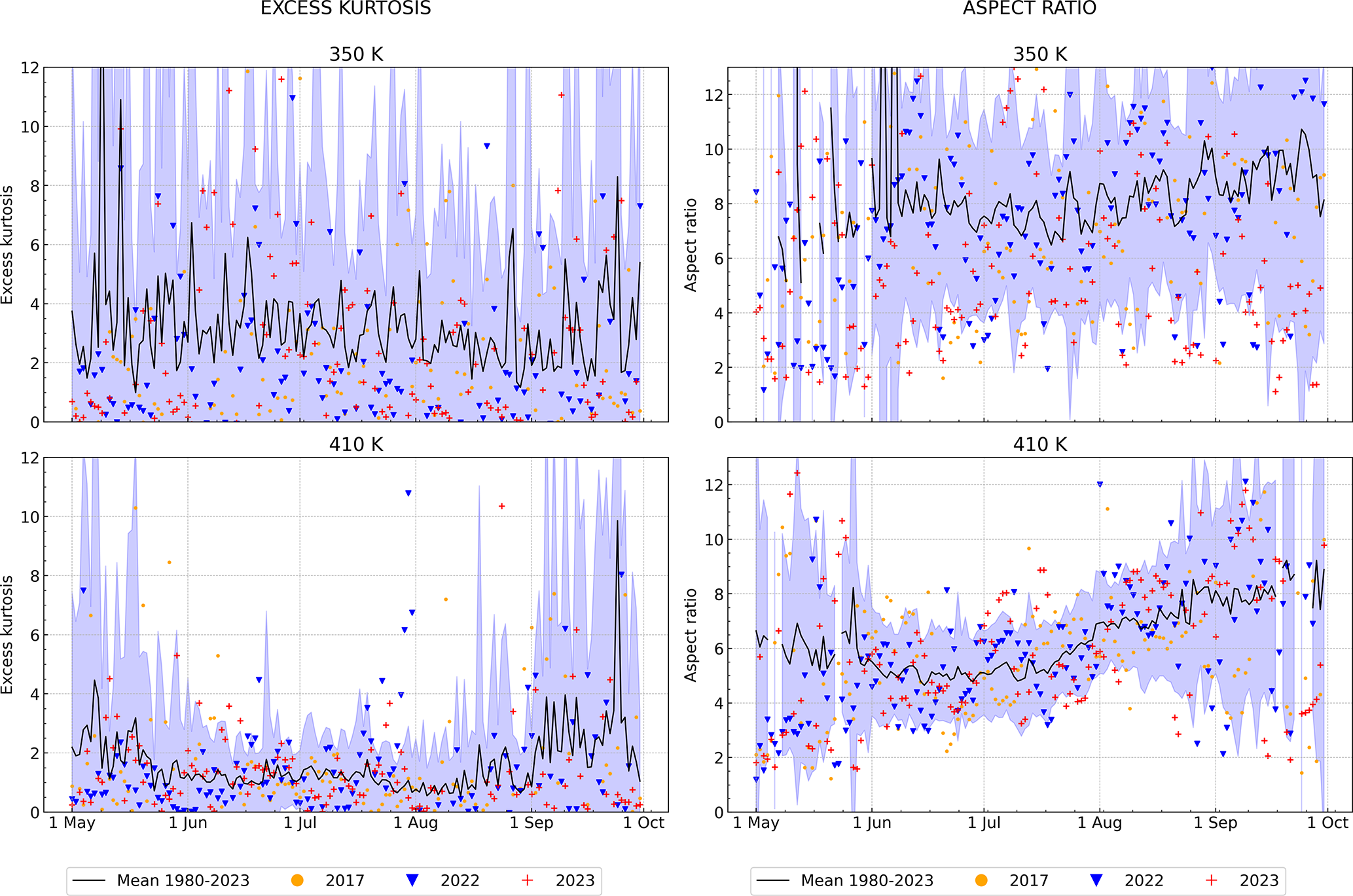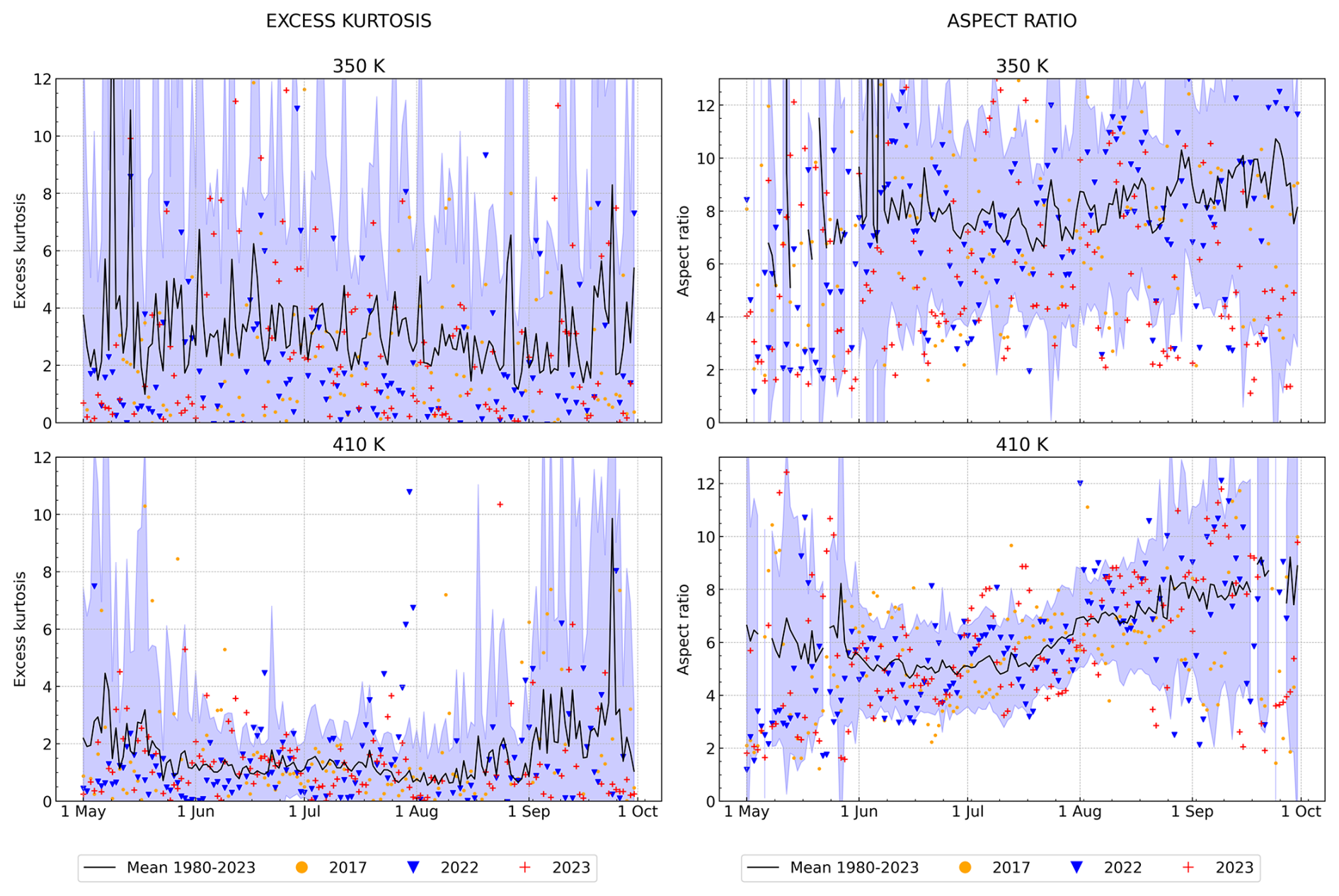 Figure D3Climatological (1980–2023) time-series (black line) of the ASMA excess kurtosis (left hand side) and aspect ratio (right hand side), and individual years of 2017 (yellow dots), 2022 (blue downward-pointing triangle), and 2023 (red plus) at 350 and 410 K. The lavender background denotes the standard deviation of the climatological data.