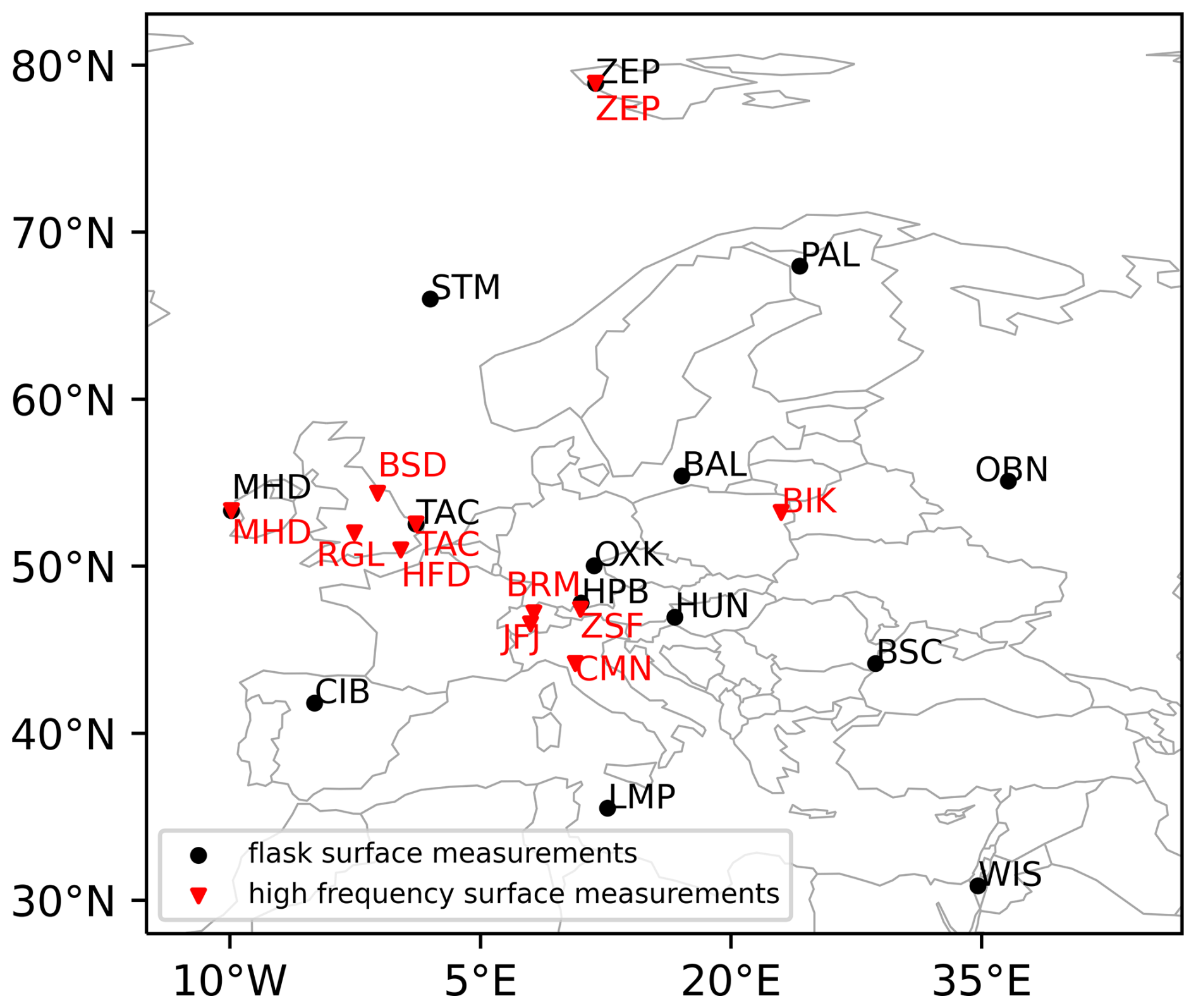 Figure 1Locations of the observation stations in and around Europe. Stations with continuous surface measurements (BIK, BRM, BSD, CMN, HFD, JFJ, MHD, RGL, TAC, ZEP, ZSF) are represented with red triangles, while surface flask measurements (BAL, BSC, CIB, HPB, HUN, LMP, MHD, OBN, OXK, PAL, STM, TAC, WIS, ZEP) are shown with black dots.