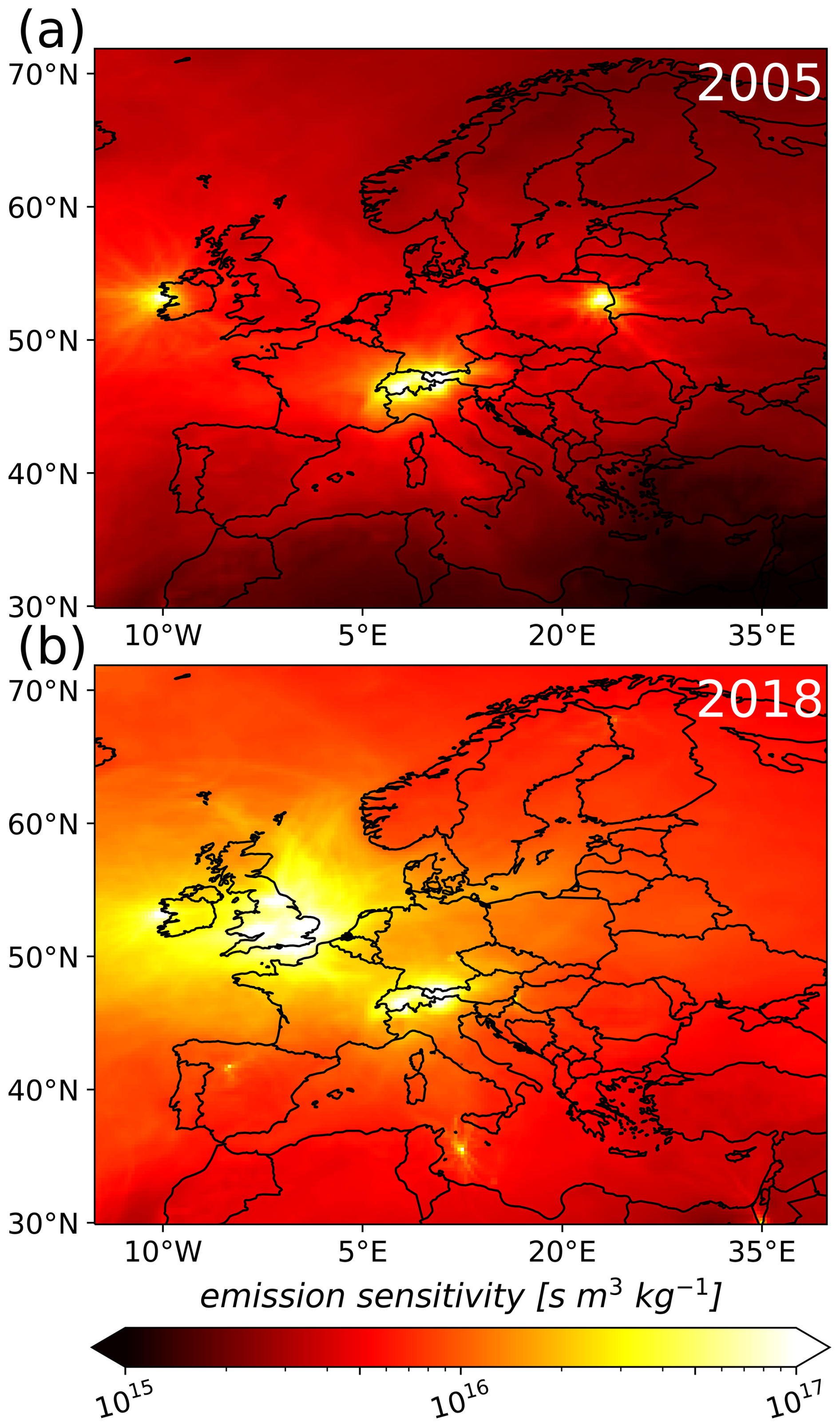 Figure 2Simulated emission sensitivities for the years 2005 and 2018 in Europe. The displayed values represent the annual sum of FLEXPART calculations. As a result, sites with frequent online observations carry more weight than those relying on flask measurements or observations from mobile platforms.