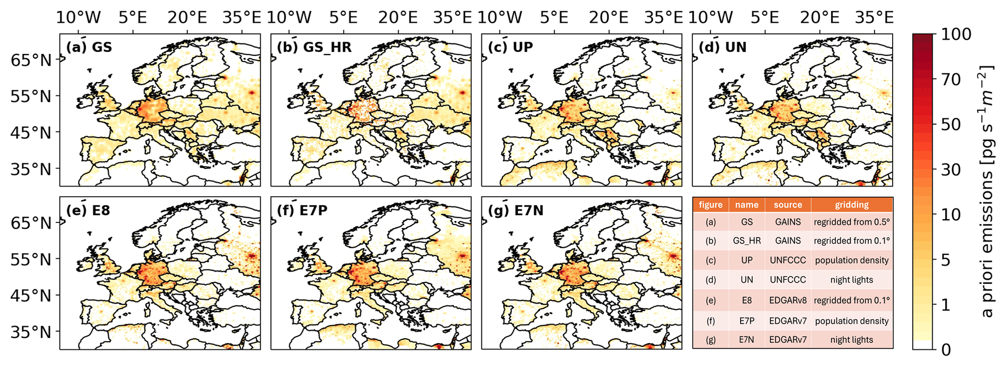 Figure 3Seven a priori emission fields, shown as an average over the study period 2005–2021: (a) GS (GAINS), (b) GS_HR (GAINS high resolution), (c) UP (UNFCCC reports – population density distribution), (d) UN (UNFCCC reports – night light remote sensing distribution), (e) E8 (EDGARv8), (f) E7P (EDGARv7 – population density distribution), and (g) E7N (EDGARv7 – night light remote sensing distribution). The table in the bottom right corner provides an overview of the ensemble.