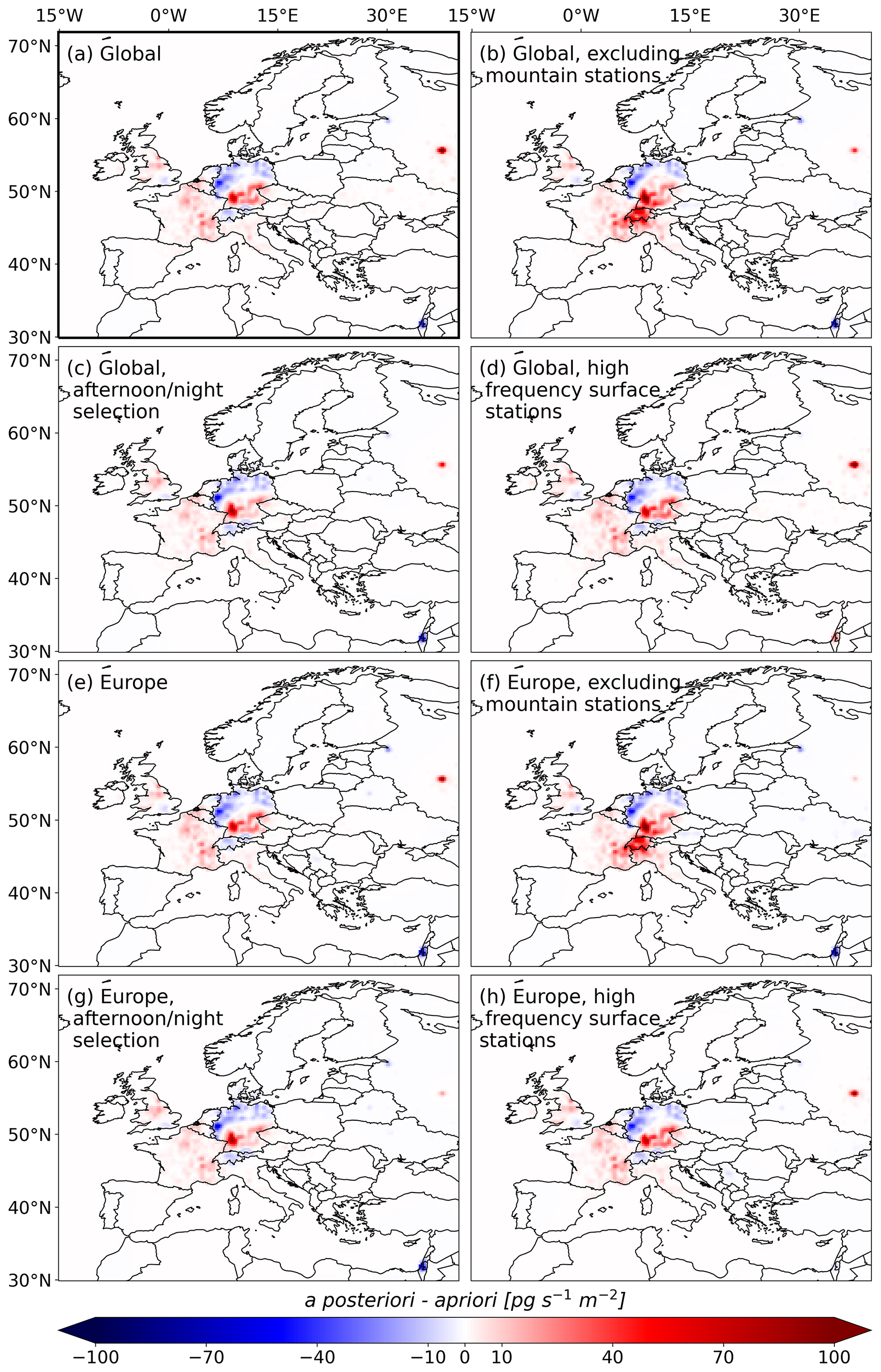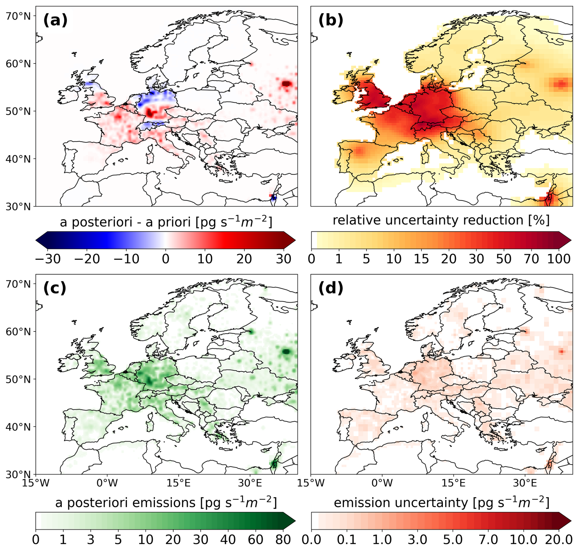 Figure 4 presents (a) the inversion increments (a posteriori minus a priori), (b) the relative error reduction, calculated for each grid cell based on the a priori and a posteriori emission uncertainties as 1-a posteriori uncertaintya priori uncertainty, (c) the a posteriori emission distribution, and (d) the a posteriori emissions uncertainty (as calculated using Eq. 4). The results are shown for the reference inversion settings, averaged over the years 2005–2021. Strongly negative increments (Fig. 4a) are found in northern Germany, particularly around Cologne, where a priori emissions are very high (see also Fig. 3). The inversion further reveals large positive increments in southwestern Germany. Other positive increments are evident in France, Italy, the UK, and Russia, whereas negative increments are observed in Switzerland, parts of Scotland, and Israel.