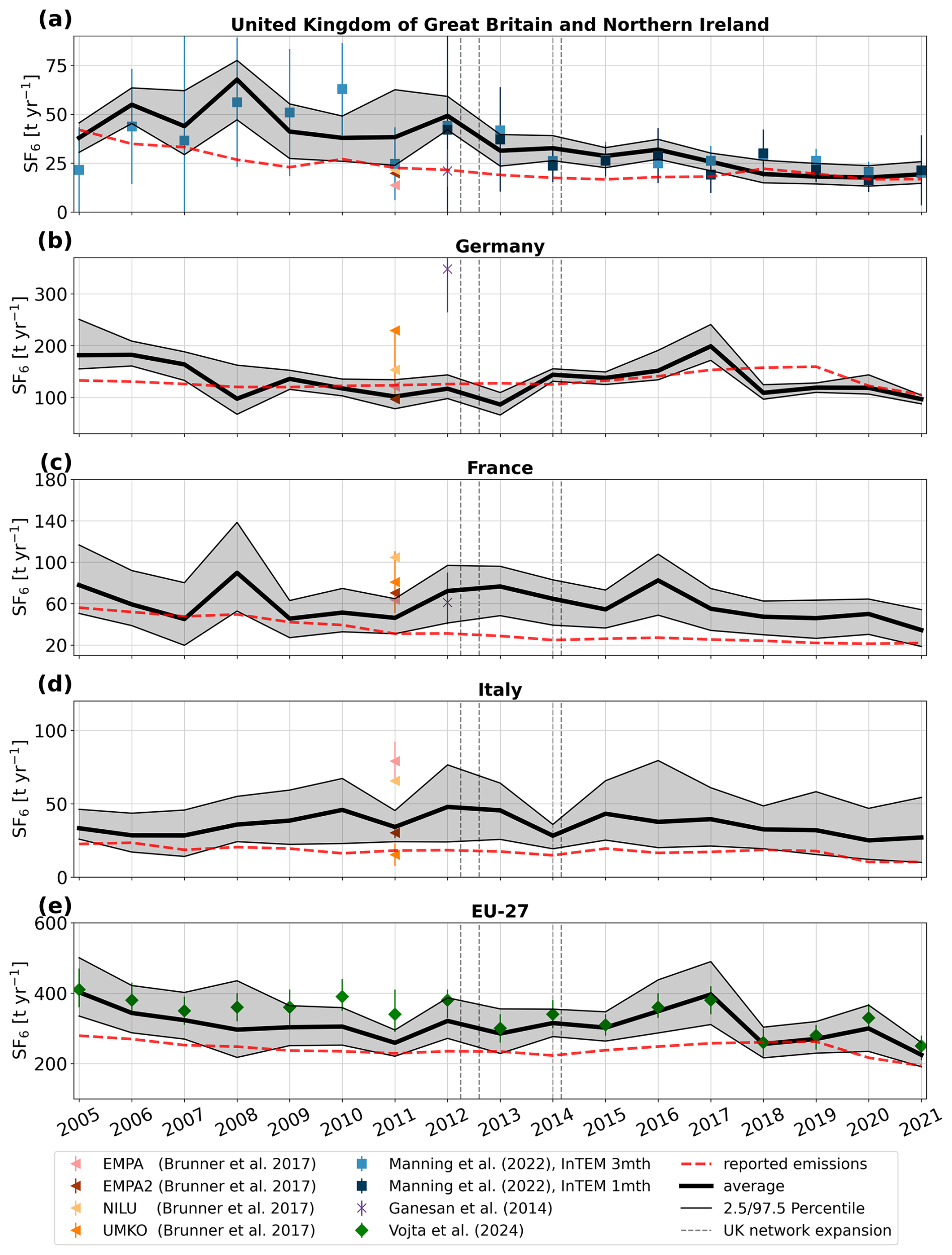 Figure 6Annual emission time series for (a) the United Kingdom, (b) Germany, (c) France, (d) Italy, and (e) the EU-27. The solid black lines represent the average a posteriori emissions across all performed inversions, and shaded areas indicate the 2.5th–97.5th percentile range for each year. The red dashed line indicates the UNFCCC reported emissions, while results from previous studies are shown with colored markers. The vertical gray lines indicate the times when additional observational data from the expansion of the UK network became available.
