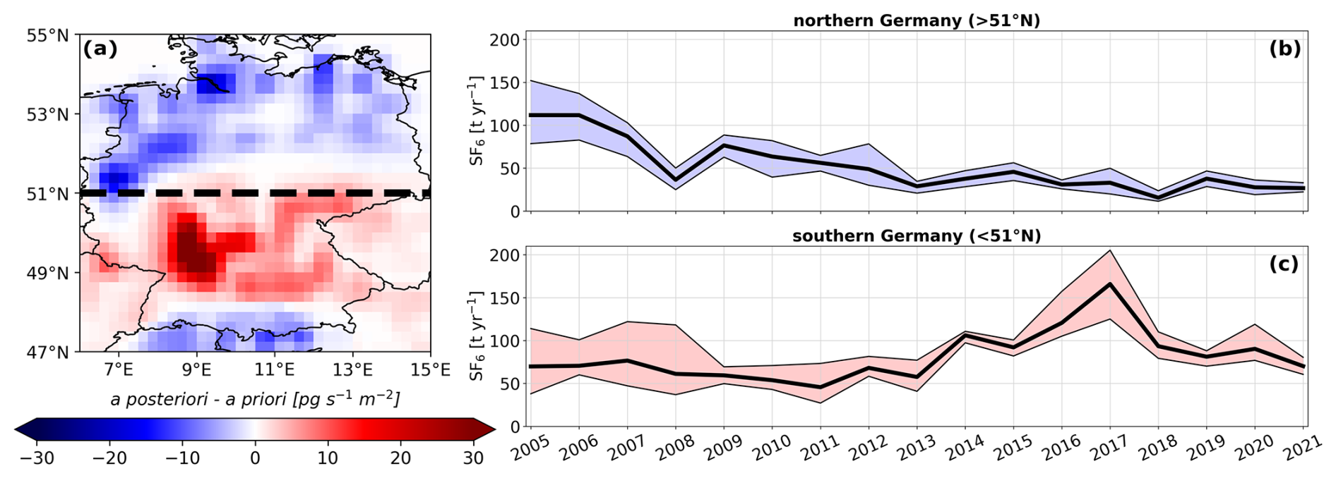 In Germany, our results show a decline in emissions from 182 (155–251) t yr−1 in 2005 to 86 (66–109) t yr−1 in 2013. Afterwards, emissions increased significantly, peaking at 199 (172–241) in 2017. This was followed by a sharp drop to 109 (97–125) t yr−1 in 2018, after which emissions stabilized. Over the entire study period, emissions decreased from 182 (155–251) t yr−1 in 2005 to 97 (88–104) t yr−1 in 2021. Overall, the German a posteriori emissions align well with the values reported to the UNFCCC, however, the inversion results reveal distinct emission trends during specific time periods that are not reflected in the reported data. Our results for Germany agree well with three of the four inversions performed in Brunner et al. (2017), but give much lower emissions than those estimated by Ganesan et al. (2014). However, their high estimates were likely a result of the use of excessive German a priori emissions ( 650 t yr−1), which were based on the EDGAR v4.2 inventory. Although their German a posteriori emissions were substantially lower than their a priori values, the inversion likely could not fully correct the huge bias present in this version of the EDGAR inventory. As mentioned in Sect. 3.1, the inversion reveals notable regional differences between southern and northern Germany, with significant negative increments in the North and substantial positive increments in the South, especially in the Southwest (Fig. 7a). To further investigate these regional variations, we examine the annual emission trends separately for the North (Fig. 7b) and the South (Fig. 7c), with the division between the two regions at 51° N. In the north, SF6 emissions decreased substantially, from 112 (79–152) t yr−1 in 2005 to 27 (22–33) t yr−1 by 2021. Note that this decrease in emissions is comparable to the reduction observed in the UK. In contrast, the southern emission trend follows a similar pattern to that of Germany as a whole, including a peak of 166 (125–205) t yr−1 in 2017, followed by a sharp decline to 93 (97–110) t yr−1 in 2018.