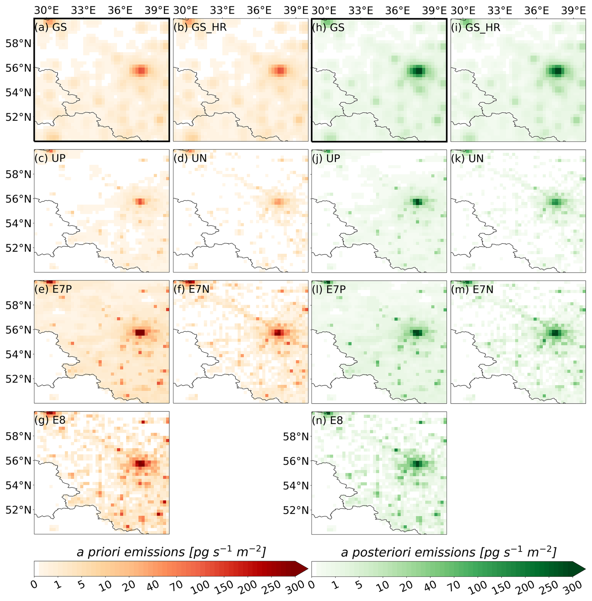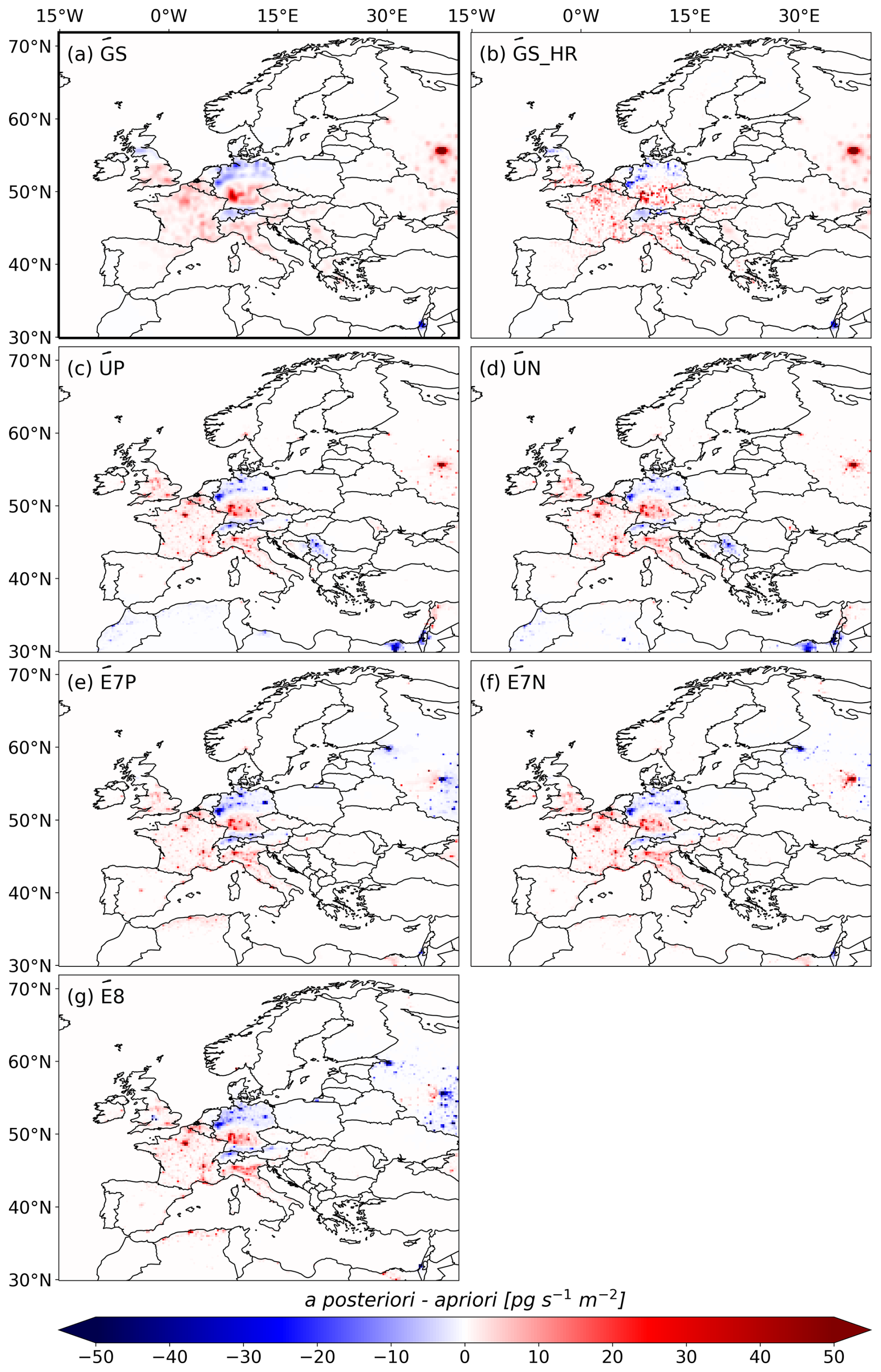 • GAINS: We created two a priori emission fields based on the GAINS inventory (Purohit and Höglund-Isaksson2017), which is detailed in Vojta et al. (2024). The inventory is available at 0.5° resolution globally and at 0.1° resolution for a European subset covering the EU-27, Iceland, Norway, Switzerland, and the UK. For the first field (GS), we re-gridded the global 0.5° inventory to 0.25° over the European domain by interpolation. For the second field (GS-HR), we used the higher-resolution European dataset, aggregated it to 0.25°, and combined it with the global dataset. While both fields thus share the same resolution (0.25° over Europe), the information content differs: GS is interpolated from coarser data, whereas GS-HR retains detail from the original high-resolution European inventory.