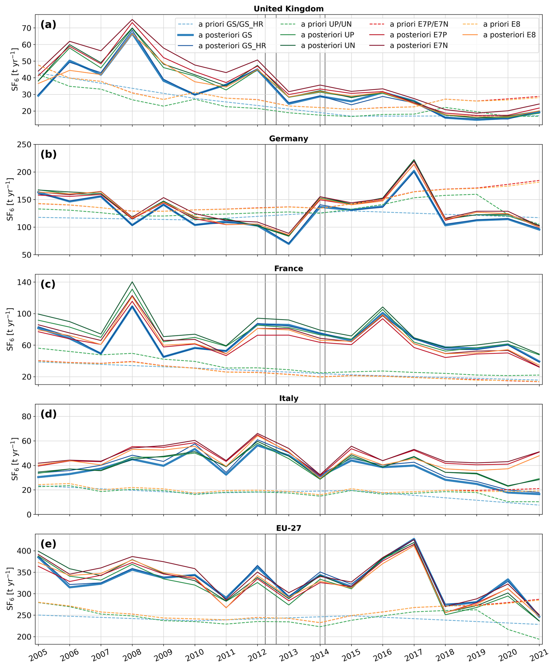 Figure 6 shows the a posteriori SF6 emission time series for (a) the United Kingdom, (b) Germany, (c) France, (d) Italy, and (e) the EU-27. In the UK, SF6 emissions declined from 38 (31–46) t yr−1 in 2005 to 19 (15–26) t yr−1 by 2021 (Fig. 6a: black solid line), with a substantial drop from 68 (47–77) t yr−1 in 2008 to 19 (15–26) t yr−1 in 2018, corresponding to an average annual decrease of −3.2 t yr−1. The substantial decrease in emissions observed after 2008 is likely a result of the 2006 EU F-gas regulations, with most bans coming into effect in 2008. Although inversion results exceed the reported values (dashed red line) by an average of 69 % between 2005 and 2017, they align closely from 2018 onward. While our results are slightly higher than the estimates of Ganesan et al. (2014) in 2012, and Brunner et al. (2017) in 2011, they are in excellent agreement with the results of Manning et al. (2022) for the whole study period, particularly from 2012 onward, when uncertainties also become significantly smaller. We find equally good agreements when comparing with the a posteriori emissions for northwestern Europe from Manning et al. (2022) (Fig. S6). These good agreements are a particularly noteworthy result, as the inversion system used by Manning et al. (2022) differs significantly from ours. Their approach employs the InTEM inversion technique (Manning et al.2011, 2021), with a priori emissions uniformly distributed across the country, large a priori emission uncertainties, and inversion intervals of 1 and 3 months (Fig. 6, InTEM 1mth, InTEM 3mth).