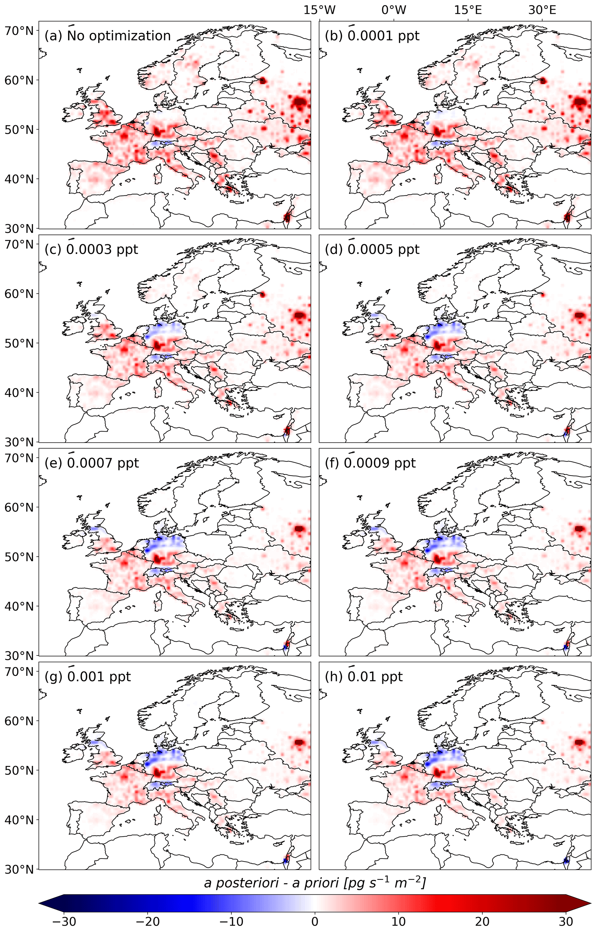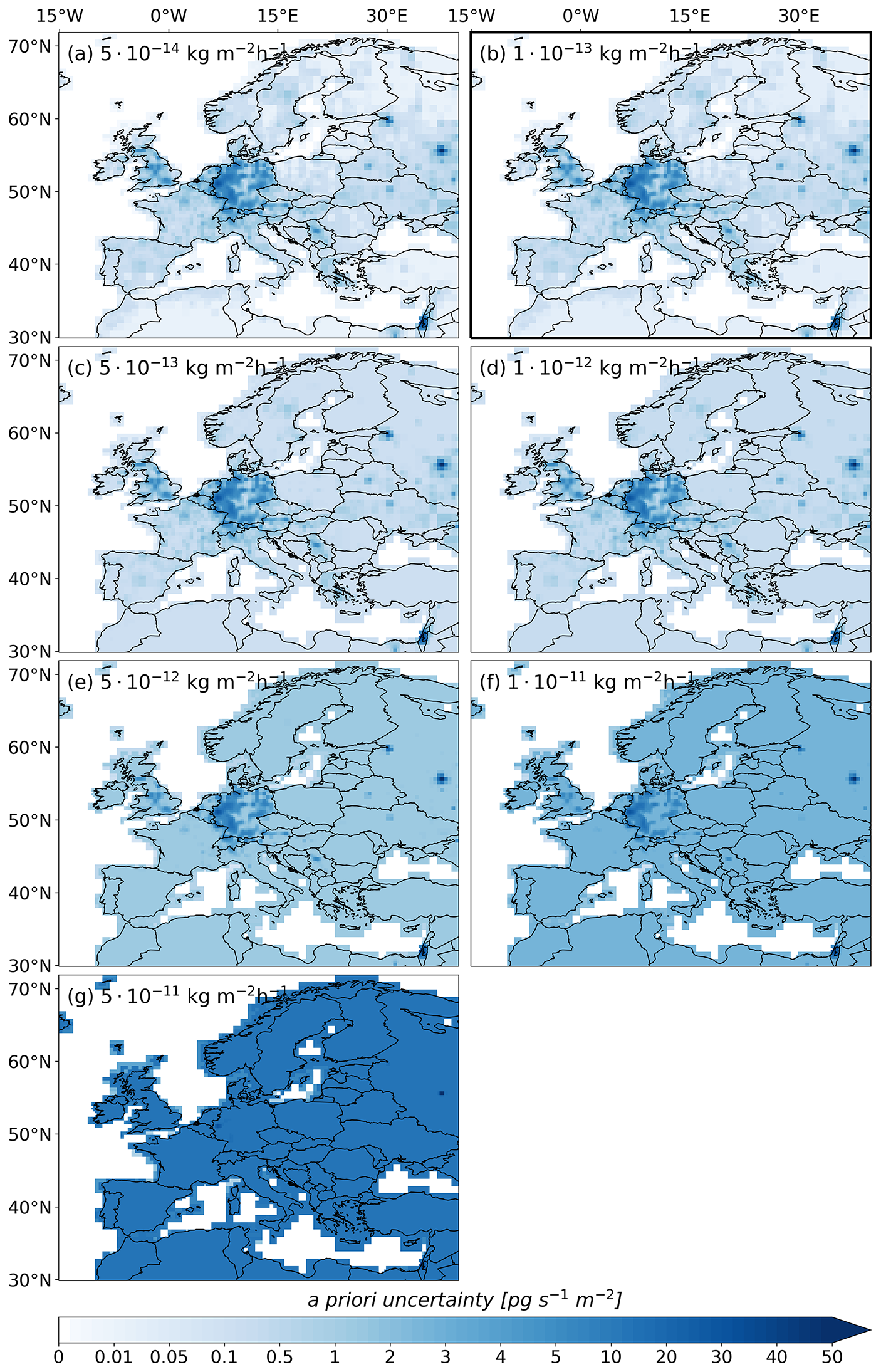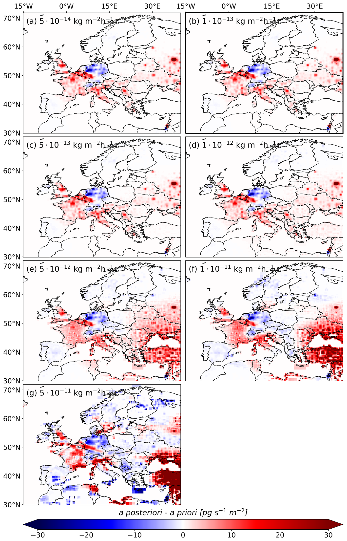 • a priori emission uncertainties: In each grid cell, the a priori emission uncertainty is calculated as a fraction of its respective emission value. We test 4 different settings with fractions of 30 %, 50 %, 70 %, and 100 %. Furthermore, different minimum absolute values for the emission uncertainty are tested, controlling the freedom of the algorithm to adjust emissions in grid cells with small a priori values. The seven minimum values tested are 5×10-14, 1×10-13, 5×10-13, 1×10-12, 5×10-12, 1×10-11, and 5×10-11kgm-2h-1.
