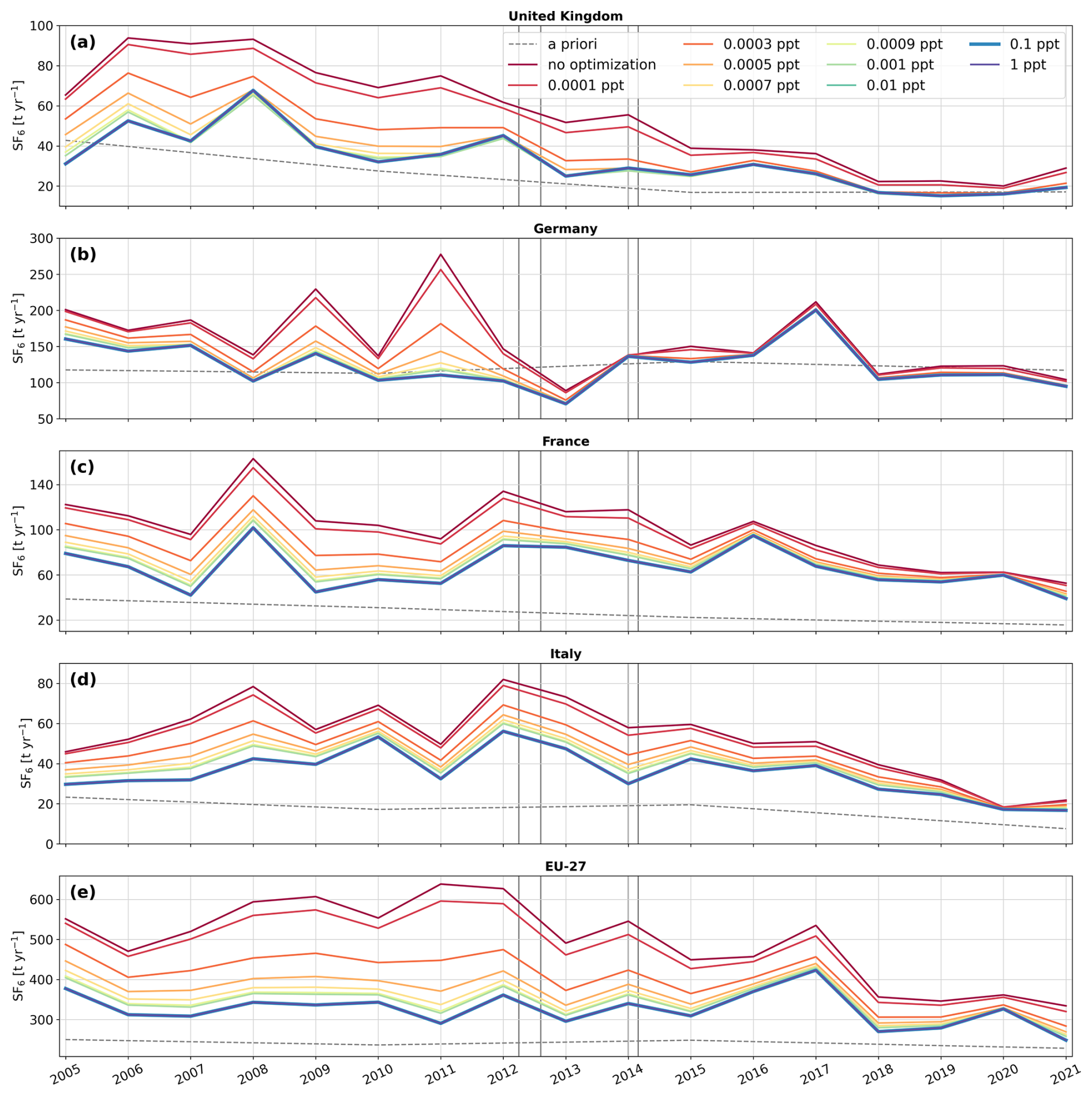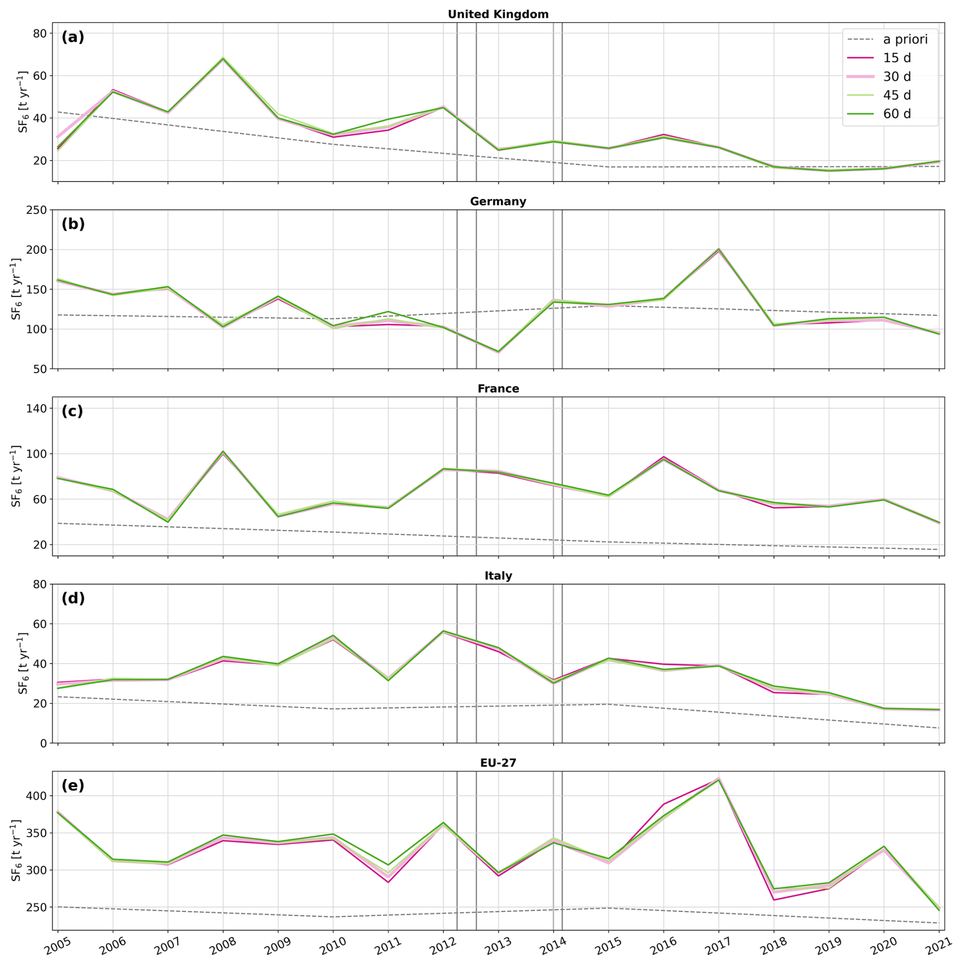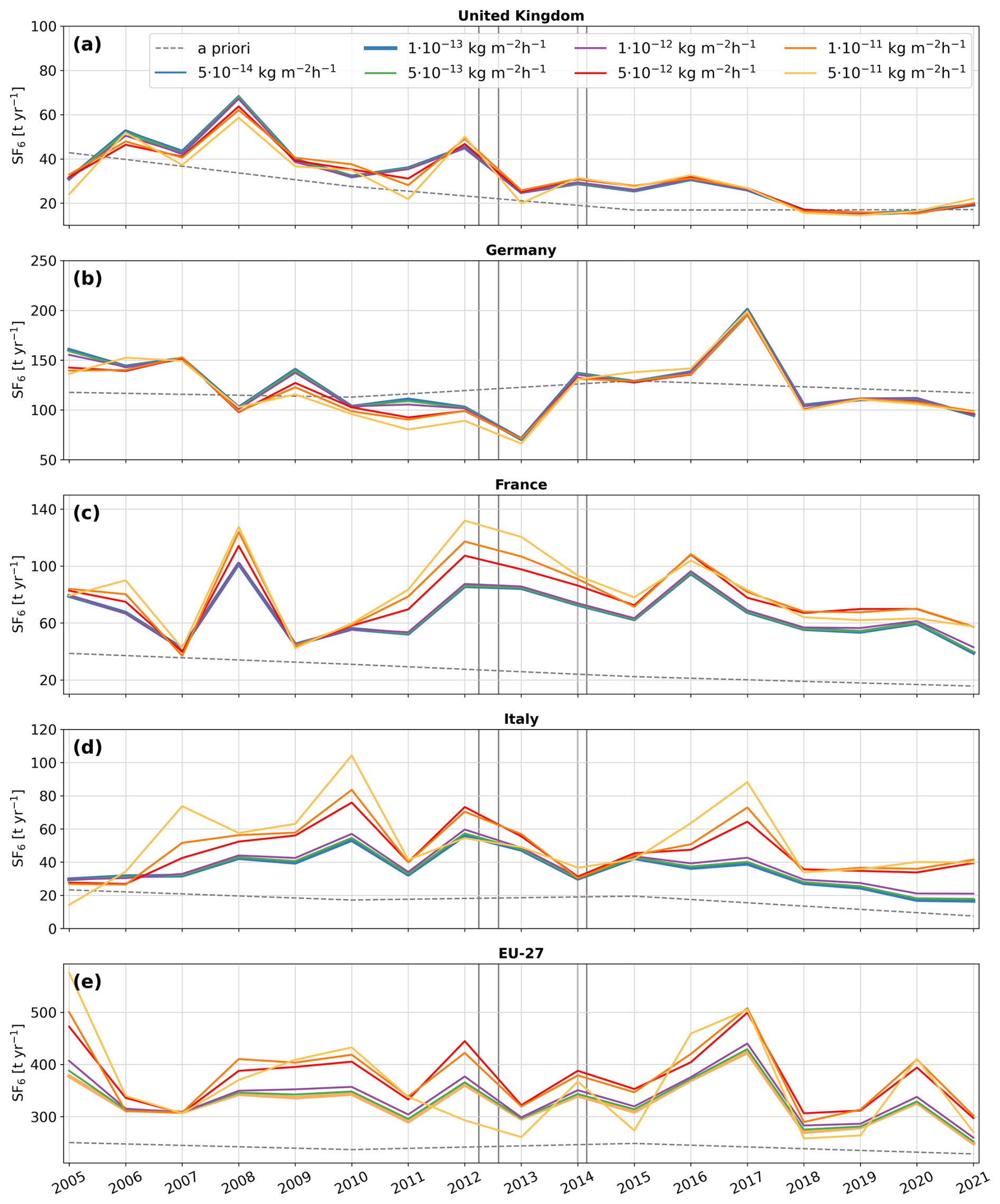 We create seven different European SF6 a priori emission fields with 0.25×0.25° resolution for our inversion domain and for the period 2005 to 2021 that are based on three different bottom-up sources: GAINS, the annual national emission reports to the UNFCCC, and the bottom-up estimates from EDGAR.