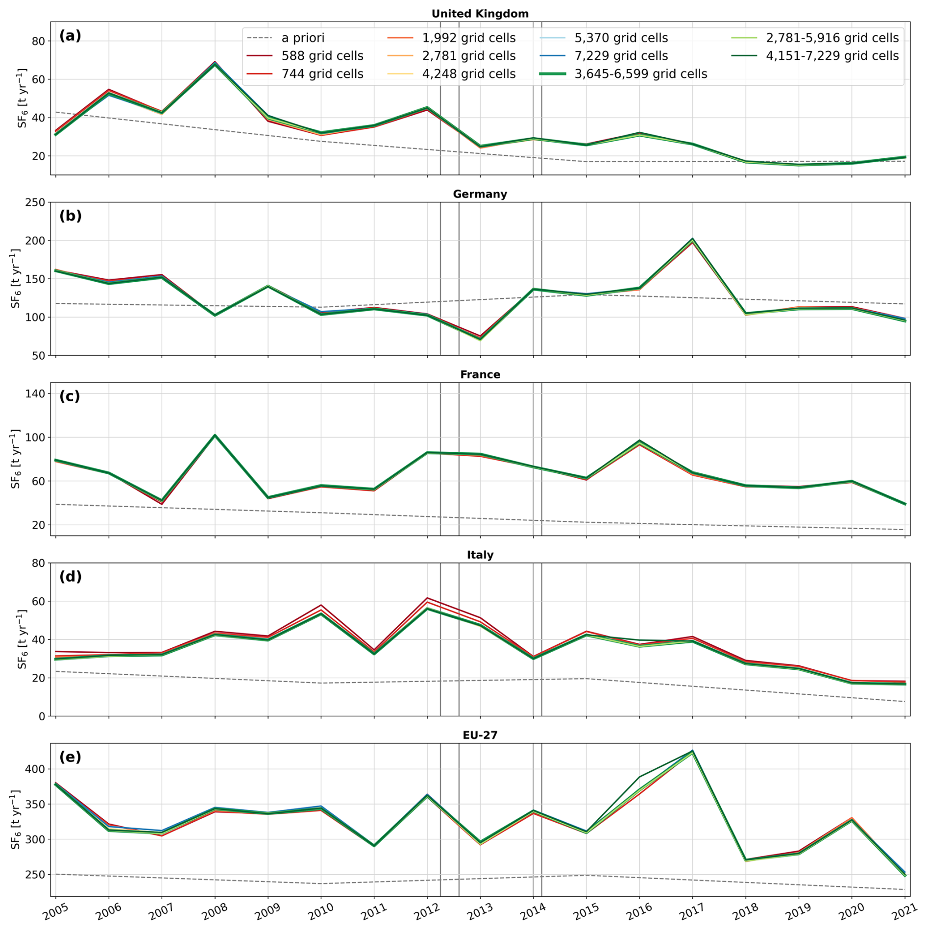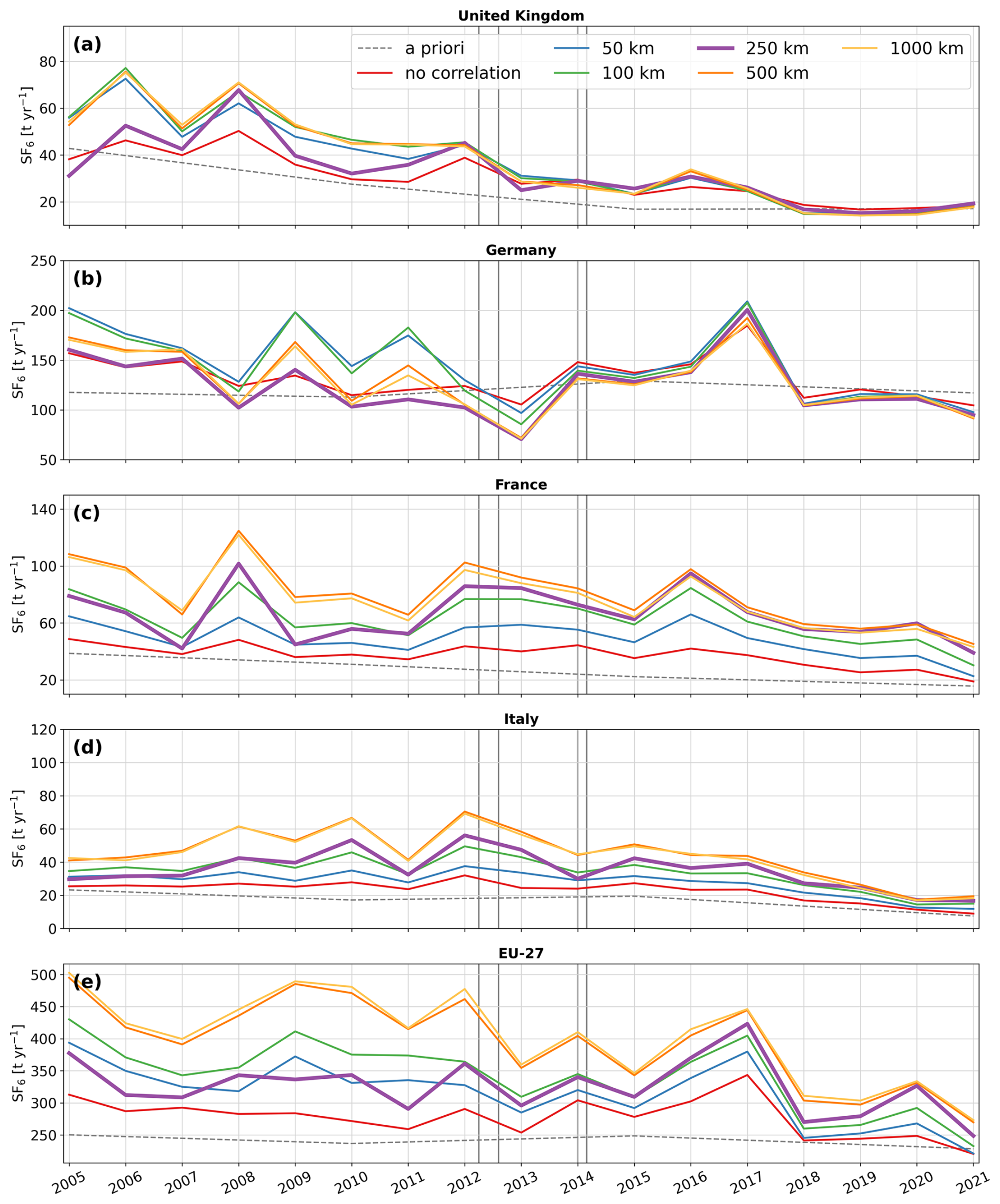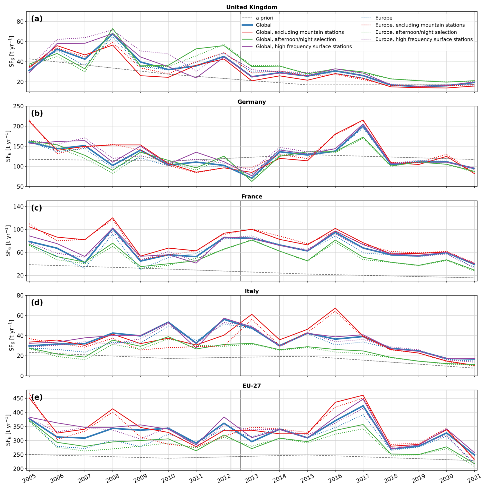 The vertical dashed gray lines in Fig. 6 indicate the times when additional observational data from the expansion of the UK network became available (RGL: March 2012, TAC July 2012, HFD: January 2014, BSD: February 2014). Consistent with our sensitivity studies, we observe that the additional observations noticeably reduce emission uncertainties in the UK. Similarly, this effect is observed in Germany, particularly in the north (see Fig. 7). However, the large southern emissions in 2016 and 2017 led to elevated uncertainties, primarily due to the use of different observational datasets (see Appendix E), making them an exception to this trend. Our tests cover a broad range of key inversion settings; however, additional factors such as alternative atmospheric transport models, wind field data, or inversion frameworks could lead to further deviations from our results. Nevertheless, the excellent agreement of the emissions in the UK and northwestern Europe (Figs. 6a and S6) with those reported by Manning et al. (2022), particularly after the network expansion, might suggest that, with a dense monitoring network, inversion results remain stable even when these factors change.